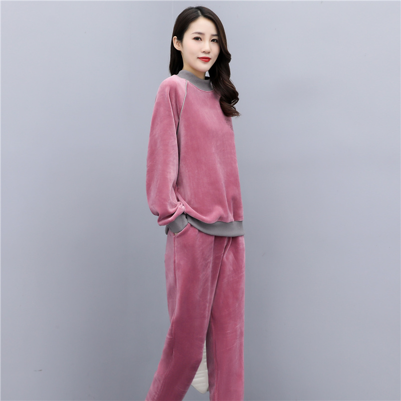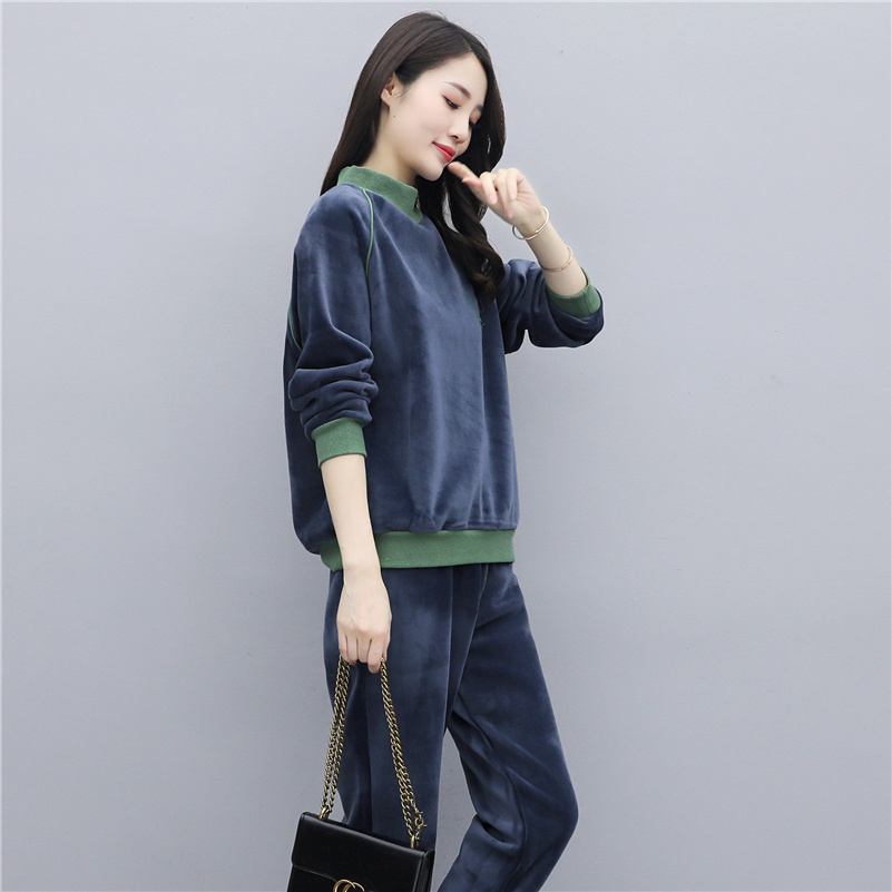 Casual sports suit female 2022 spring new color contrast stitching loose kindergarten uniform gold velvet sweater two-piece set