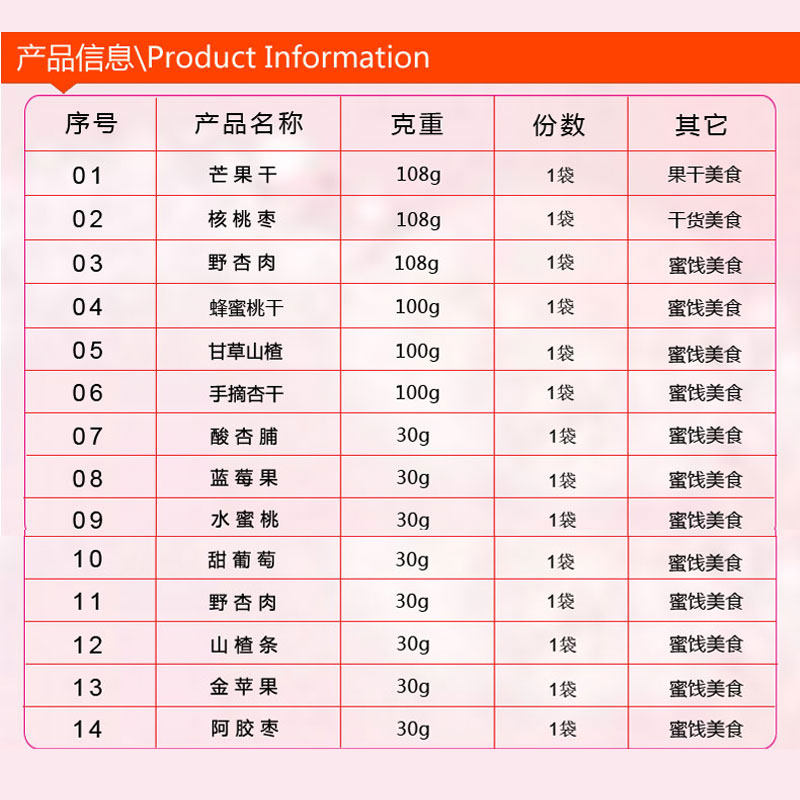 Dried apricots, apricot meat, blueberries, hawthorn, raisins, walnuts, red dates, mangoes, dried peach