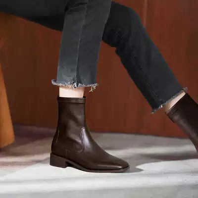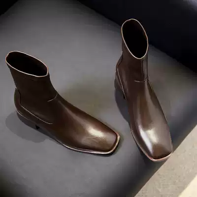 Xiaofuzi booties women's autumn and winter thick heel all-match elastic thin boots square head Martin boots leather brown Chelsea boots
