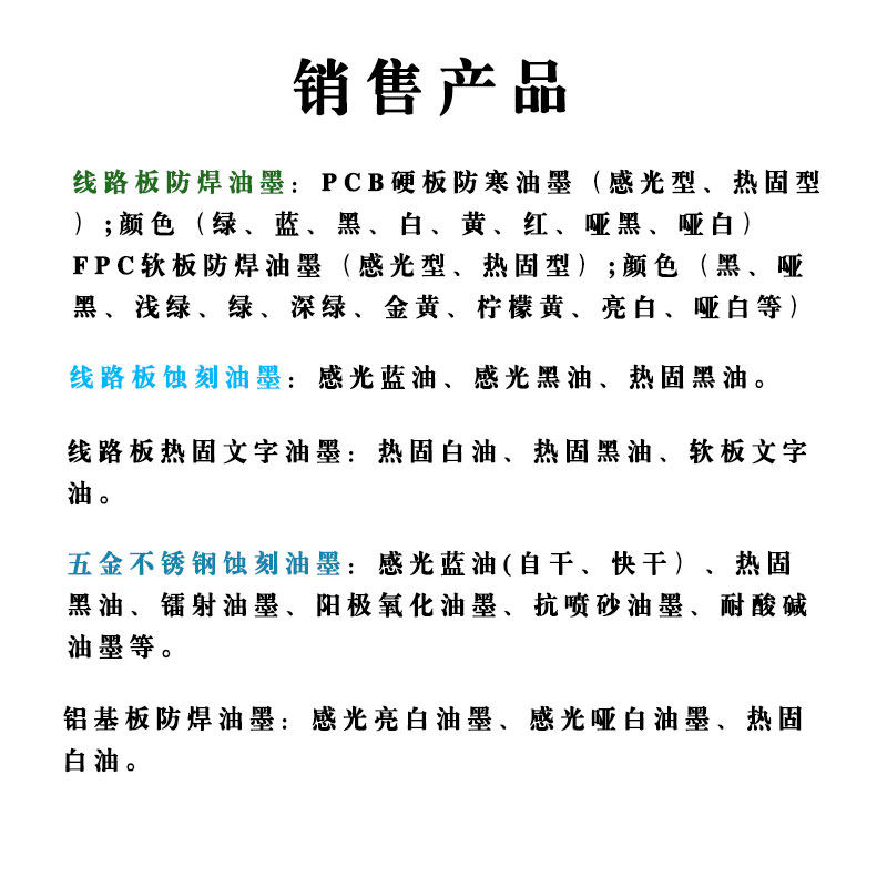 PCB thermoset text white oil PCB thermoset text black oil hardware etching blue oil Chuanyu photosensitive etching blue oil PCB hard board anti-soldering green oil (multiple colors) aluminum substrate anti-soldering white oil soft board thermosetting anti-soldering black oil (multiple colors) flexible board photosensitive anti-soldering black oil (multiple colors) FPC thermosetting text white ink antenna board thermosetting white oil black oil (glossy matte) module board photosensitive green oil butter light strip plate hot fixing bright white matte white ink high precision photosensitive green anti-soldering ink anti-blast black ink two-component anti-etching blue oil