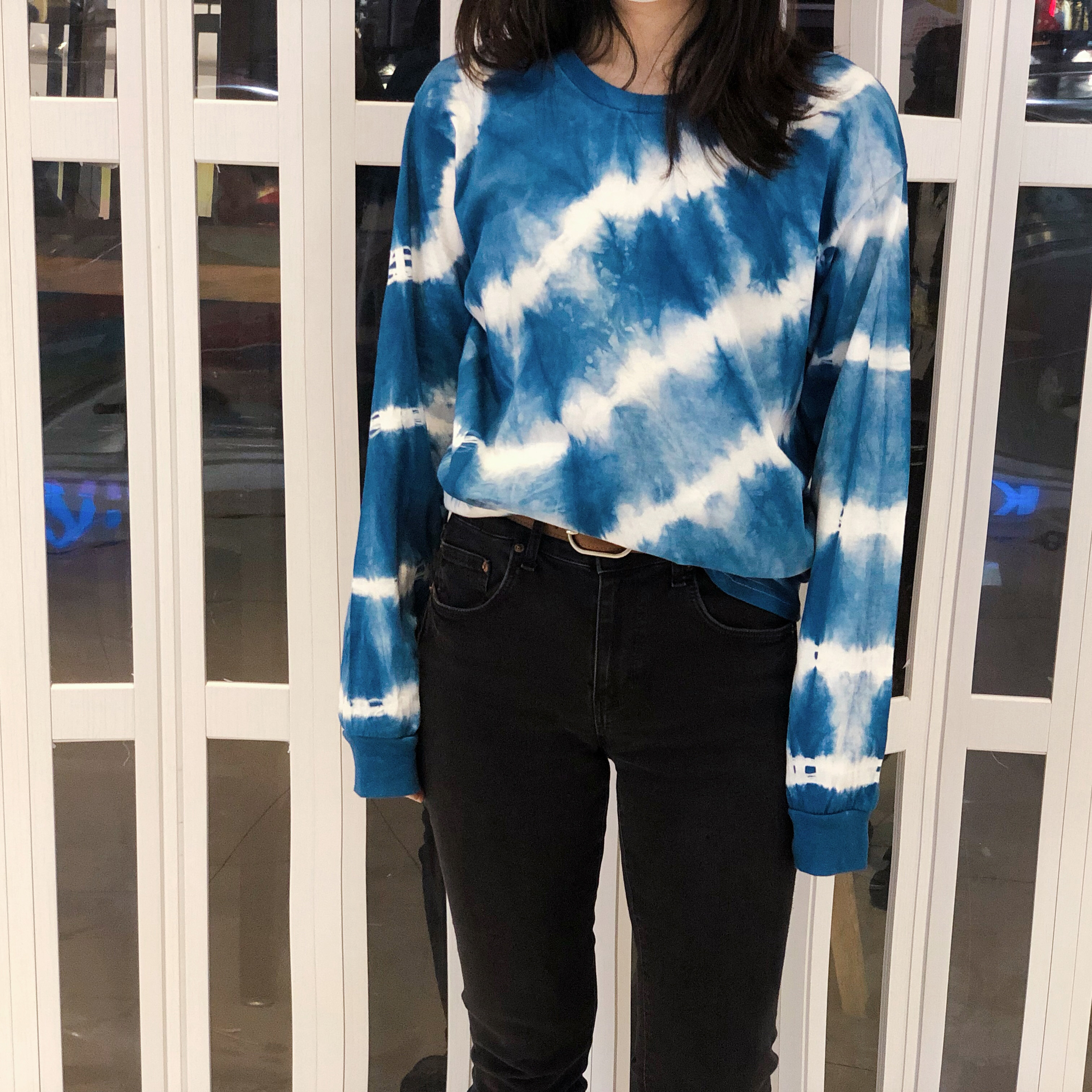 Original autumn and winter oblique stripes water ripple pattern handmade blue dyed pure cotton sweater tie-dye all-match bottoming shirt for men and women