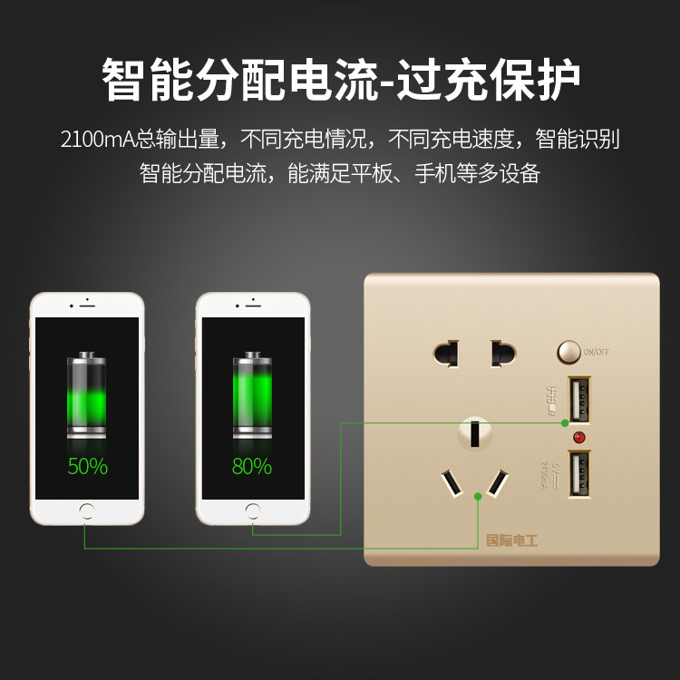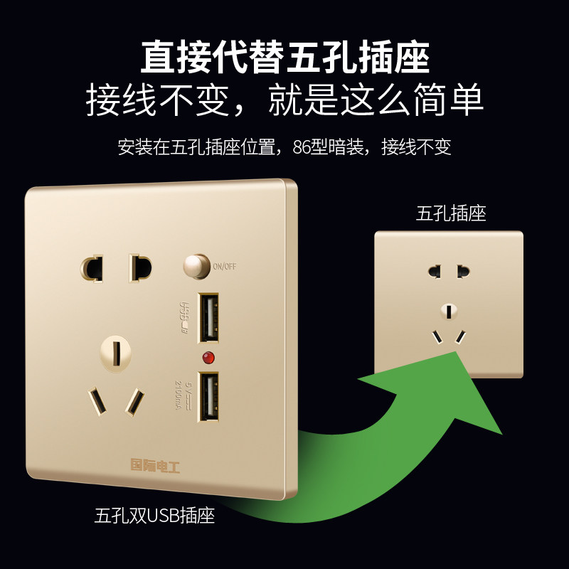 (multicoloured optional) Five-hole double USB with switch (white) Five-hole double USB with switch (gold) Five-hole dual USB with switch (grey) Five-hole dual USB with switch (black) Five holes