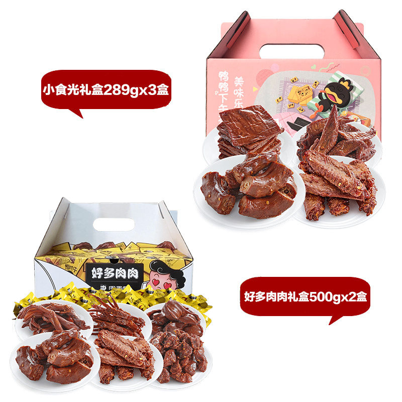 A lot of meat gift box 500g *2 (including 6 kinds of duck meat snacks) snack light gift box 289g * 3 boxes thank you gift iron gift box 360g * 2 boxes duck reduction snack gift pack (10 bags of explosive snacks) 11th anniversary store celebration gift box 1195g 7 bags (including tiger skin chicken claw chicken sausage grilled gluten, etc.) Demon you eat duck gift package 720g * 2 boxes (a total of 1440g about 104 sachets) Meat feast plus gift box 1140g (DIY gift box) to be updated 1 To be updated 2