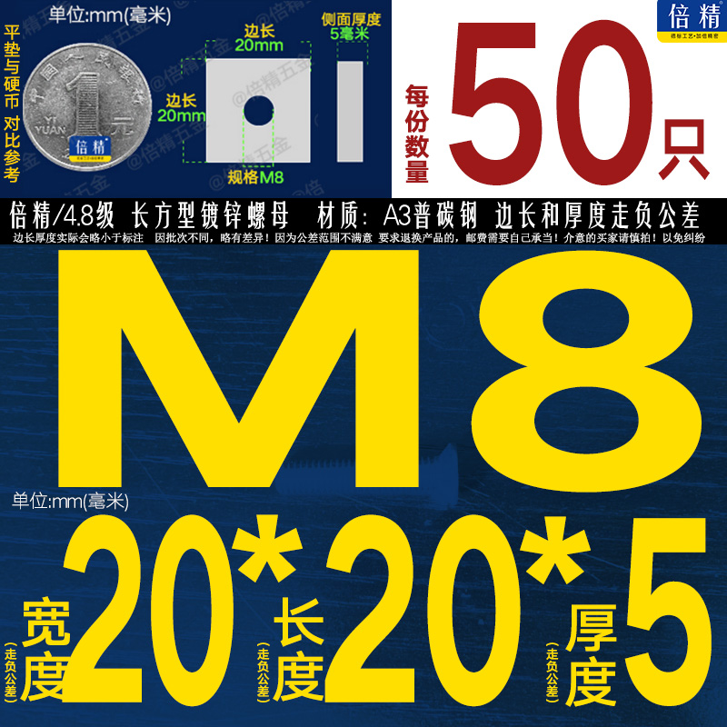Galvanized square nut square square thin nut Quadrilateral screw cap Four corners thick M2 5M3M4M5M6M8M10
