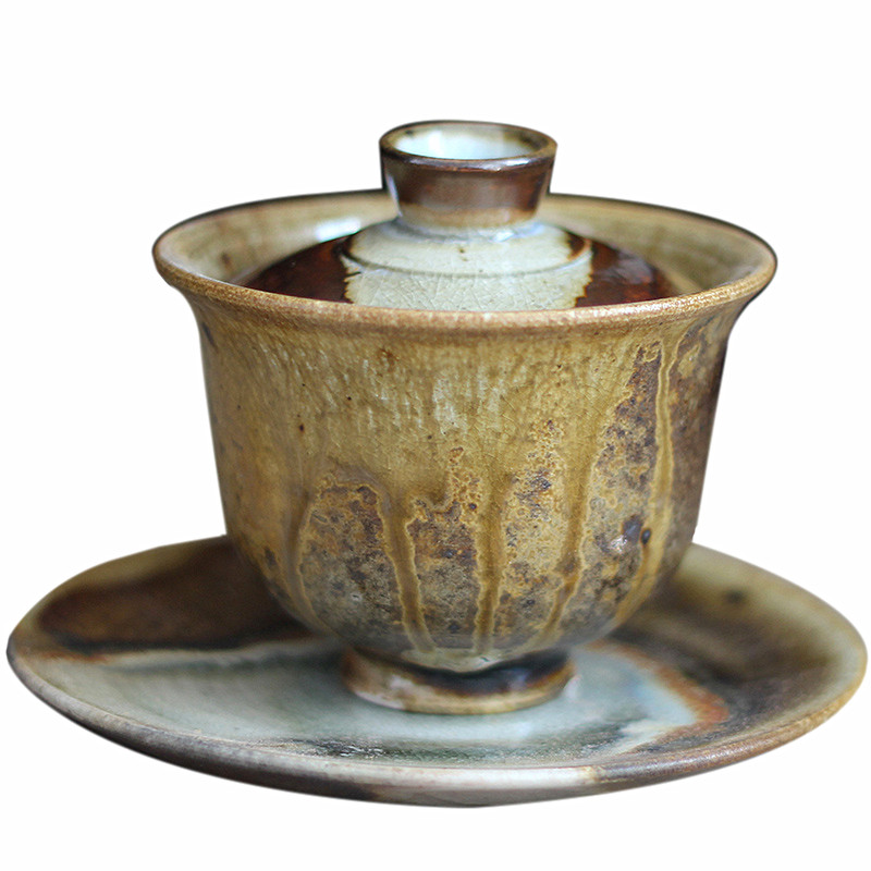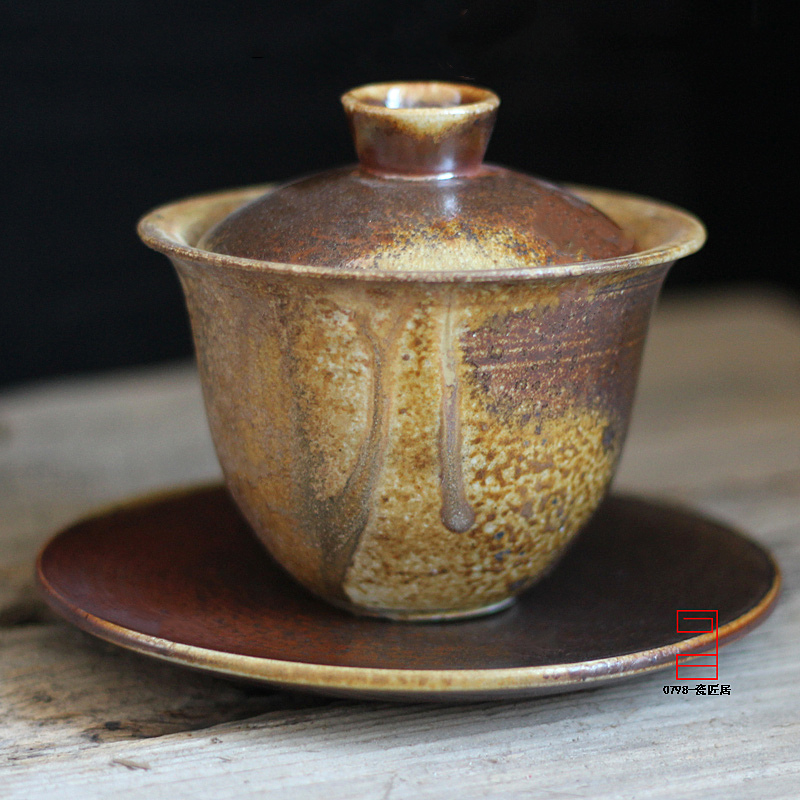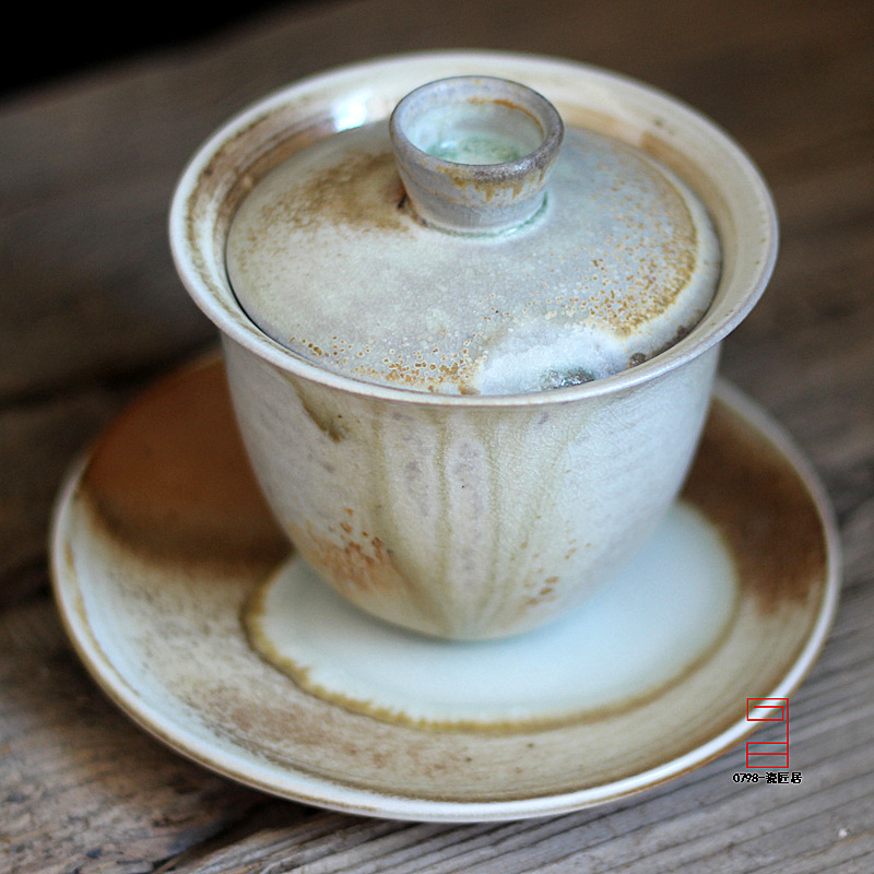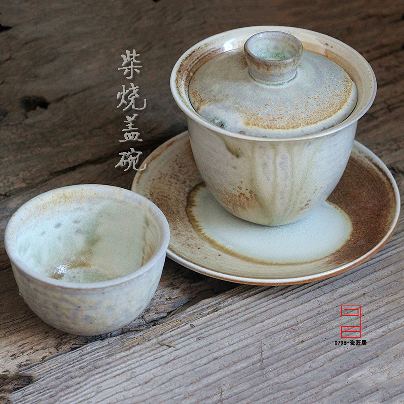 Thick fire Jingdezhen Chinese-style natural ash unglazed wood-fired ceramics handmade three-talented bowl tea bowl kung fu tea set