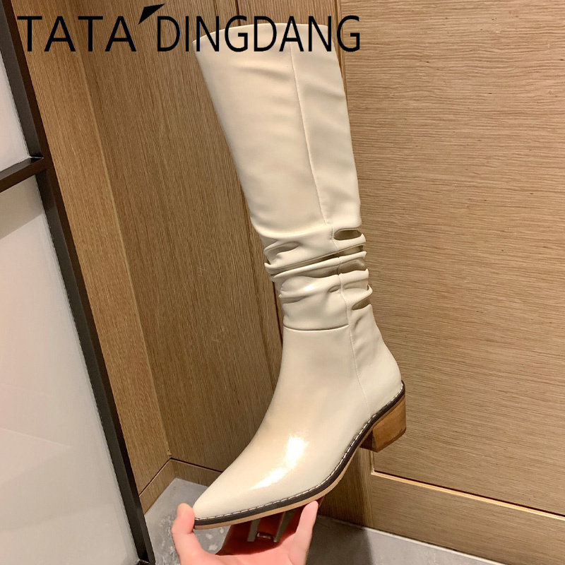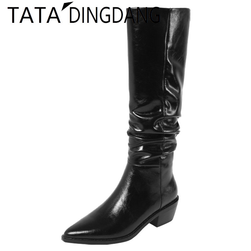 TATA DINGDANG genuine leather long cylinder boot riding boots pointed western denim boots brown long boots on her female shoes