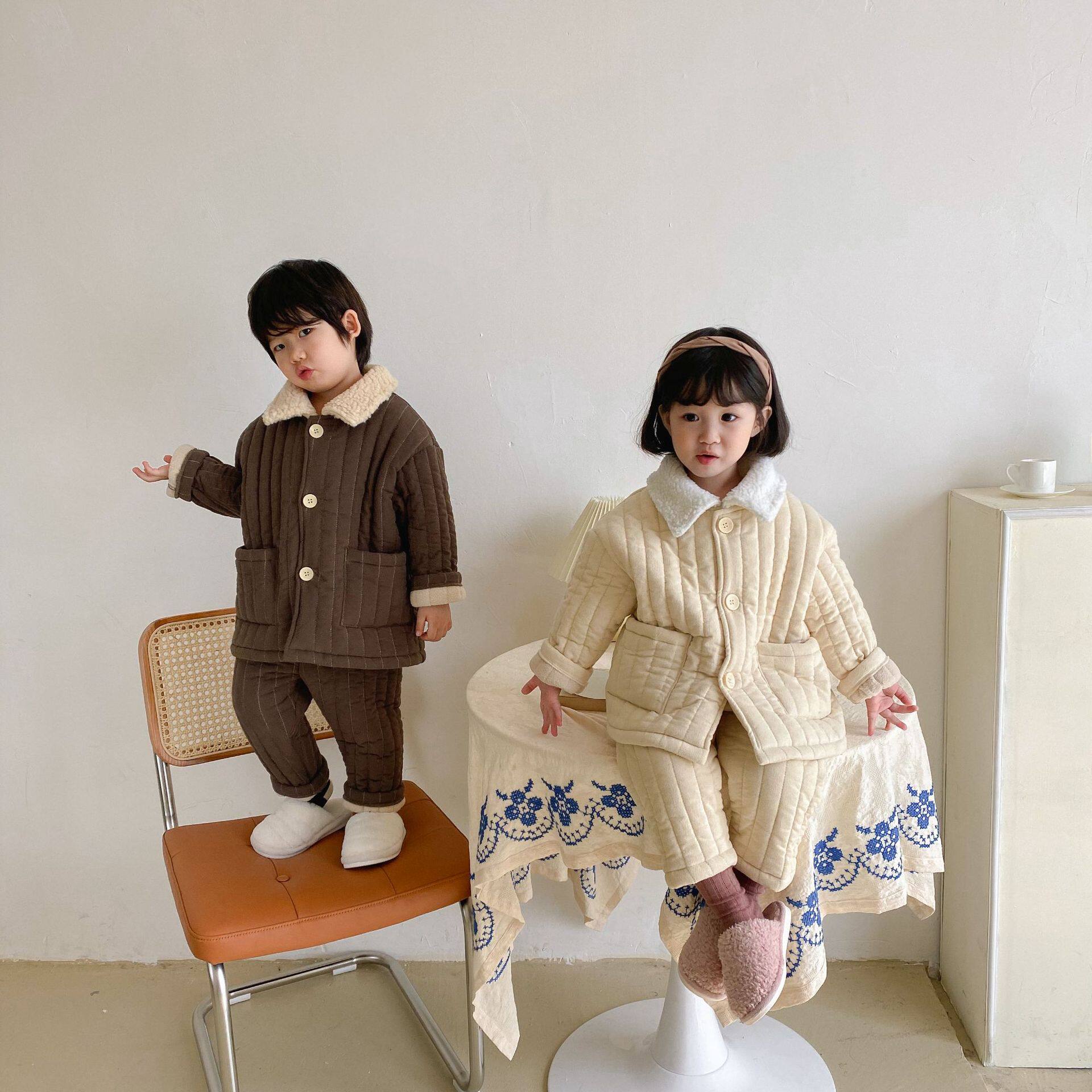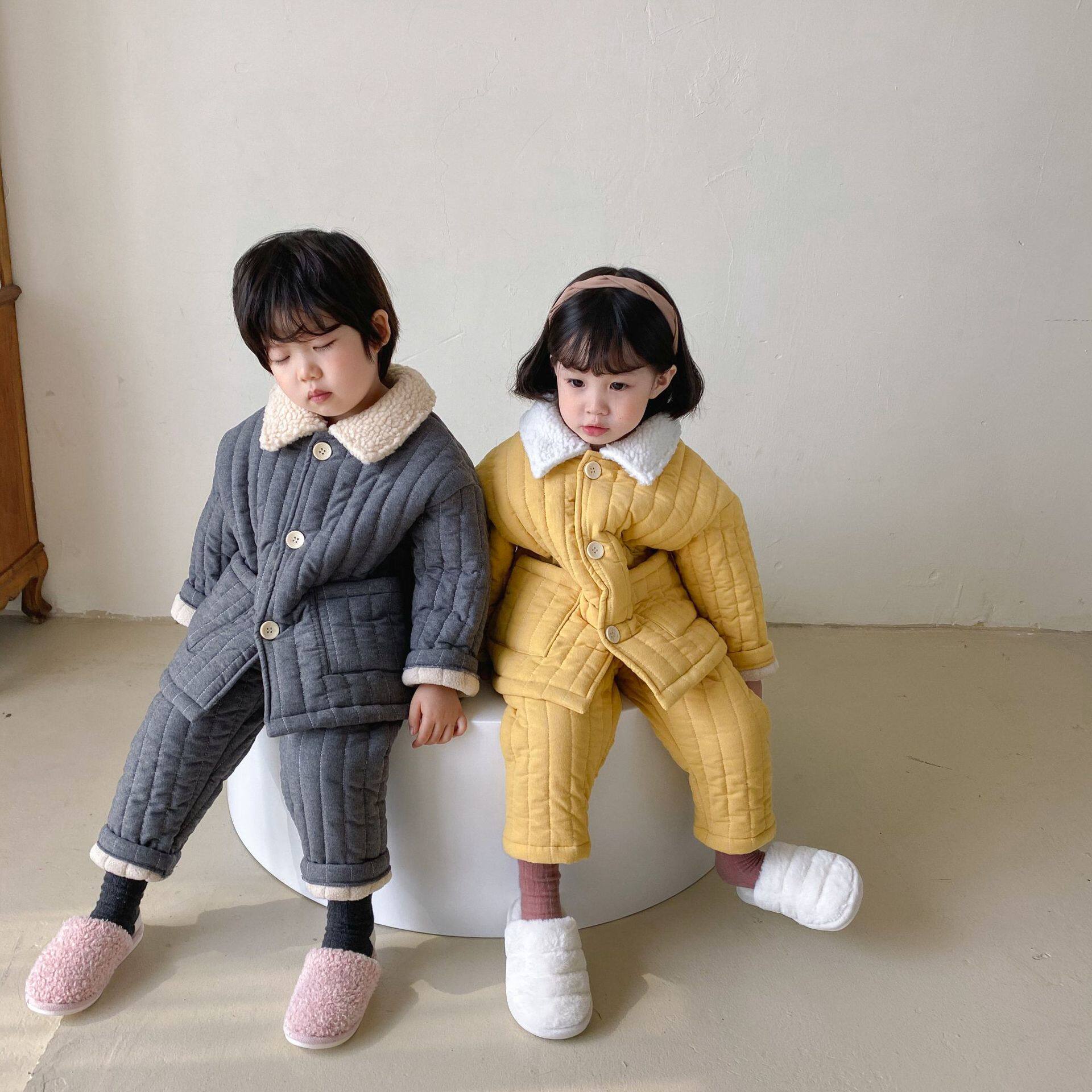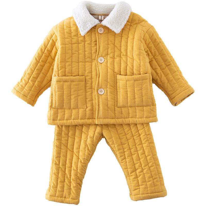 Children's three-layer cotton thickening pajamas winter Korean Edition of warm home clothes rubbed out-colored suit
