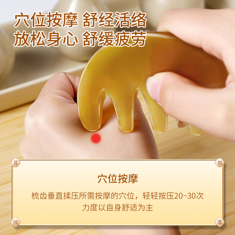Five-tooth massage comb (cow angle) Five-tooth massage comb (cow angle) Five-tooth massage comb ( two-mounted) Eight-tooth massage comb (resin) Six-teeth massage comb (cow-horn) Three-tooth massage comb (tree)