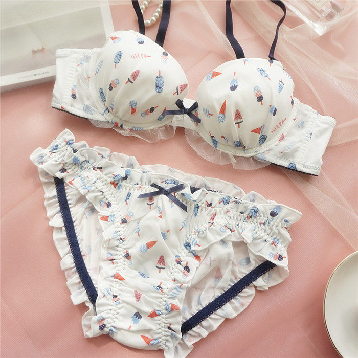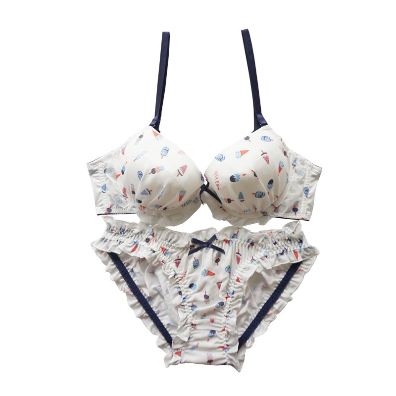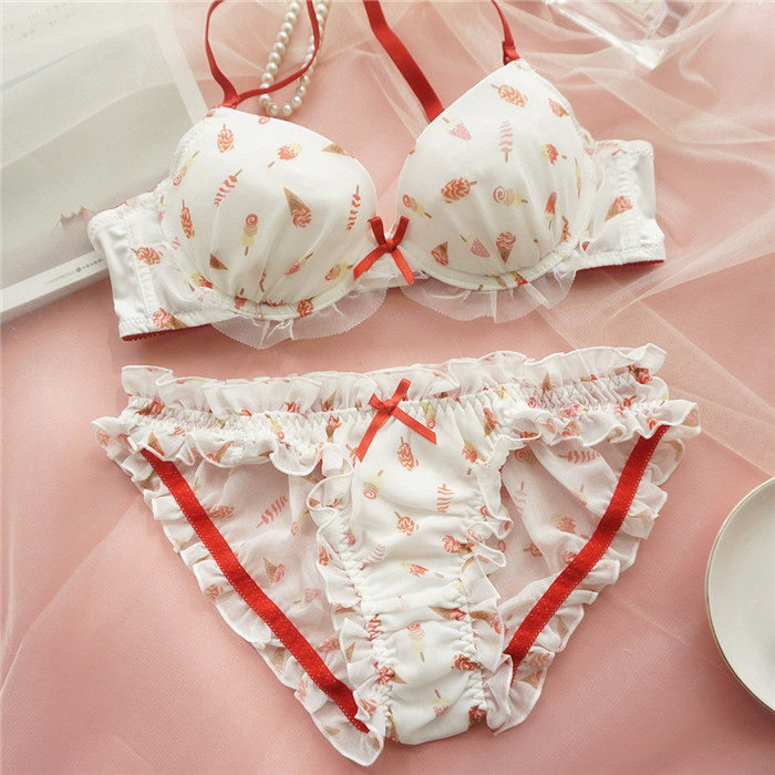 Japanese girls gather bra set ice cream print cute chiffon bra small chest gather underwear panties