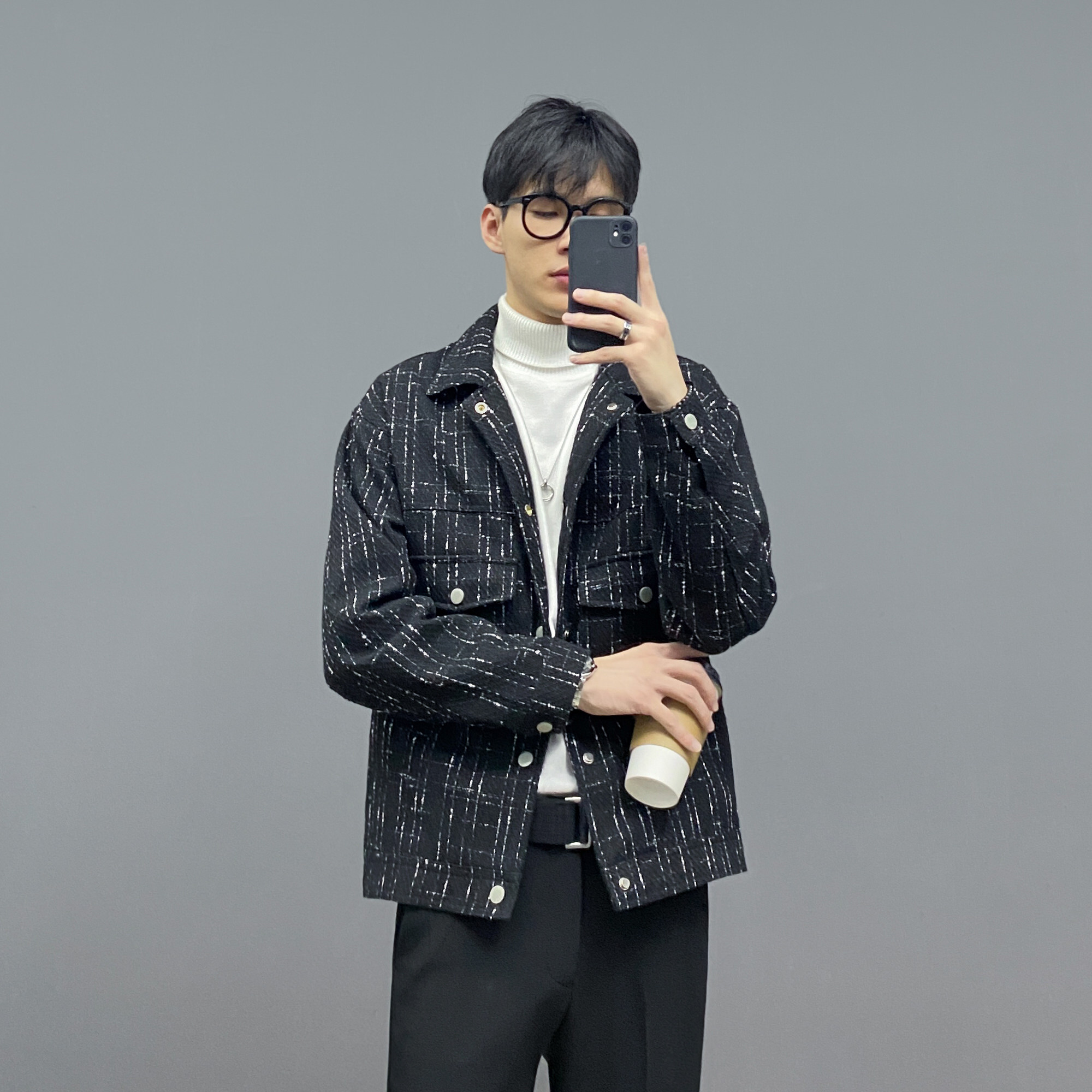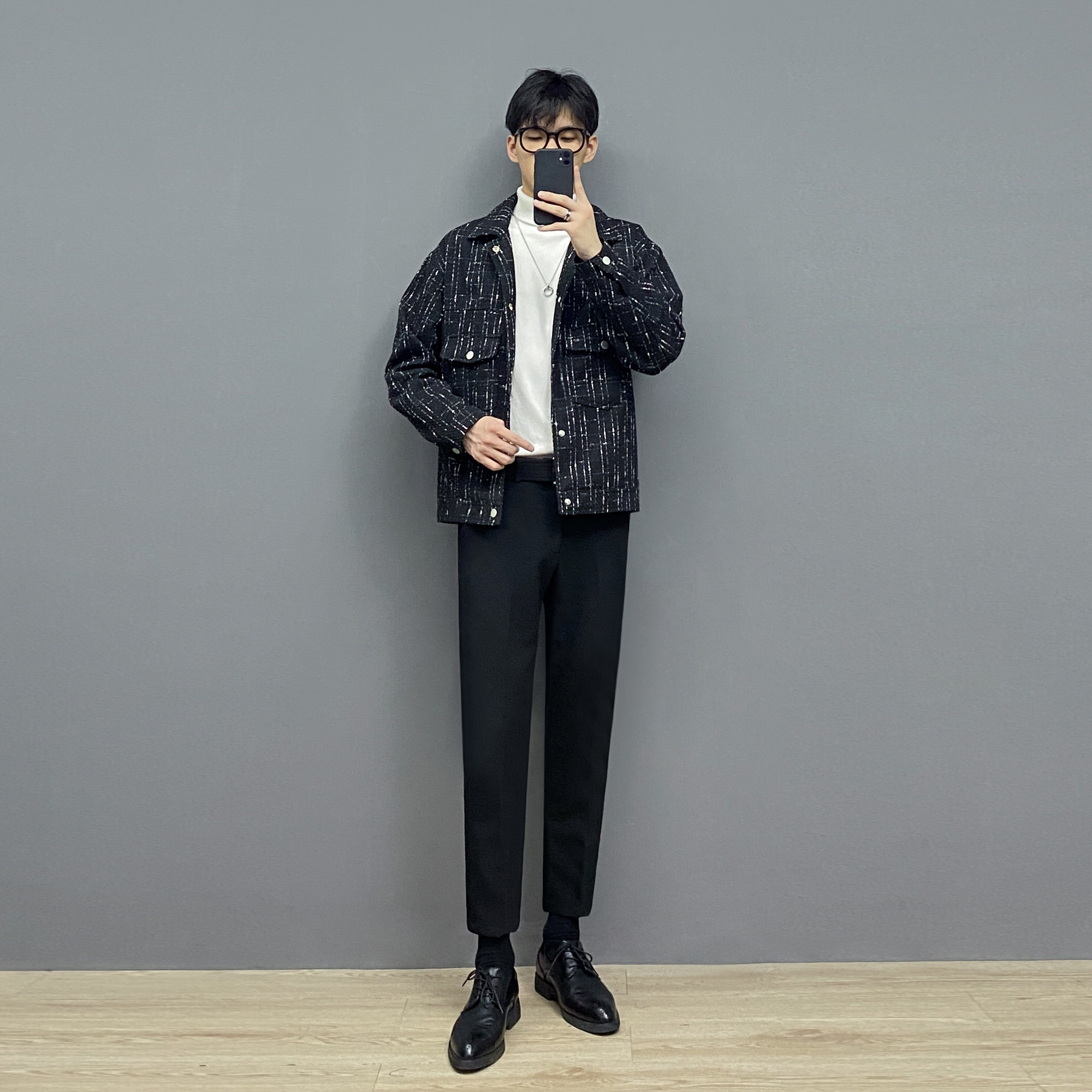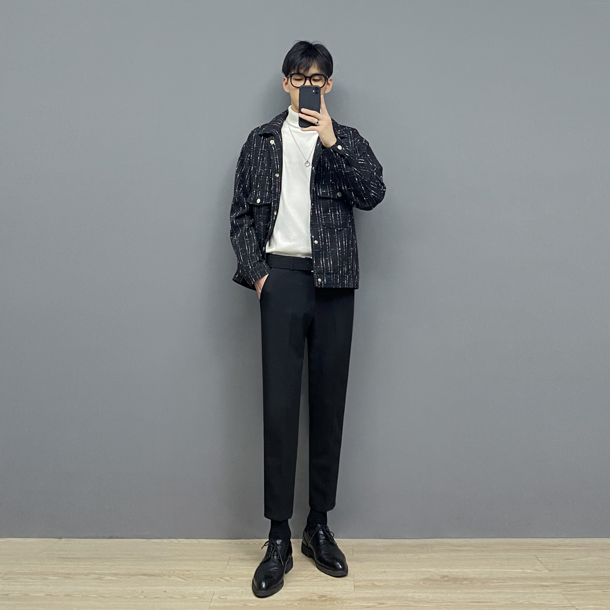 Jacket jacket (black) inner lap sweaters (white) inner lap sweaters (black) Western pants-thickened (black) business leather shoes (black) 38-44 yards