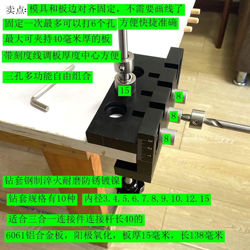 Three-hole multi-function furniture three-in-one puncher log tenon connector punching locator drill sleeve height 30 mm