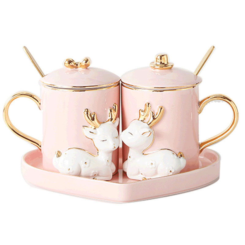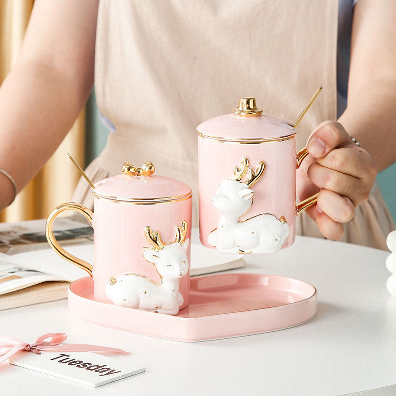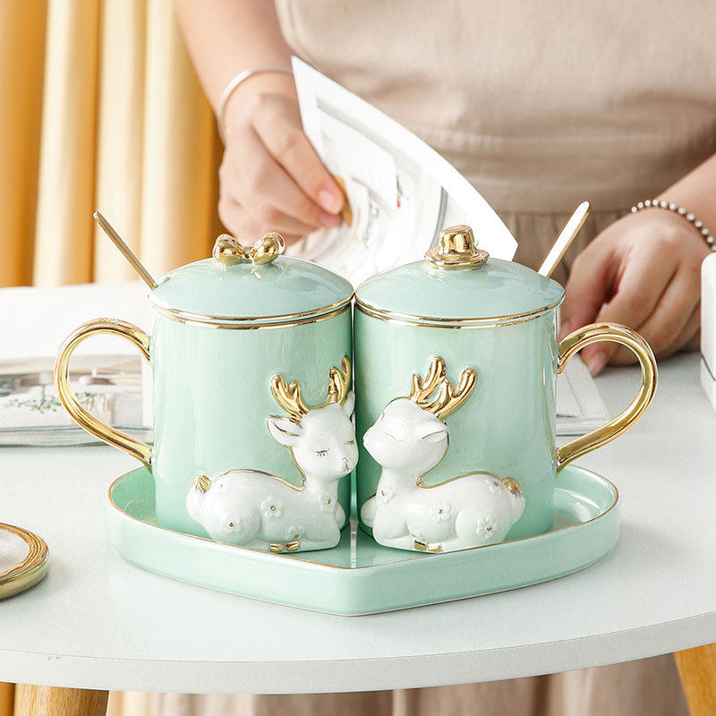 Cute deer couple cup Creative ceramic water cup with lid Spoon Gold handle Mug Three-dimensional deer cup pair cup two-piece set
