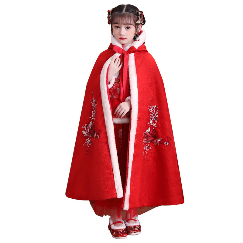 Children's shawl cloak baby out windproof hooded jacket girls plus fleece Hanfu cape Chinese style autumn and winter