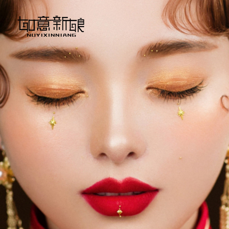 Bride's red face with flashing bright bright slice of stage makeup starMoon tears drilling face face finishes pearls