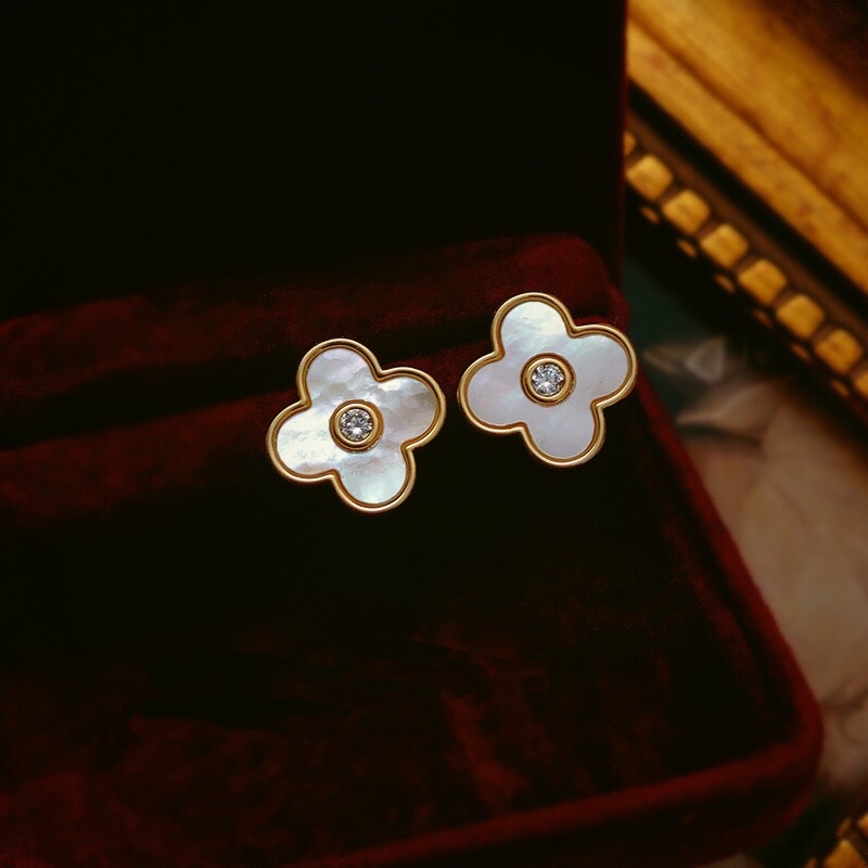 S925 new other ear holes natural shell exquisite four-leaf stud earrings temperament ear jewelry French retro