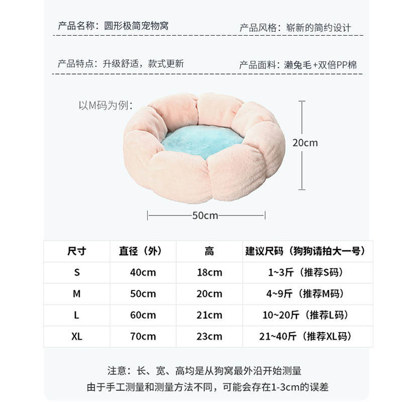 S-diameter 40cm is suitable for pets within 3kg M-diameter 50cm is suitable for pets within 9kg L-diameter 60cm is suitable for pets within 20kg XL-diameter 70cm is suitable