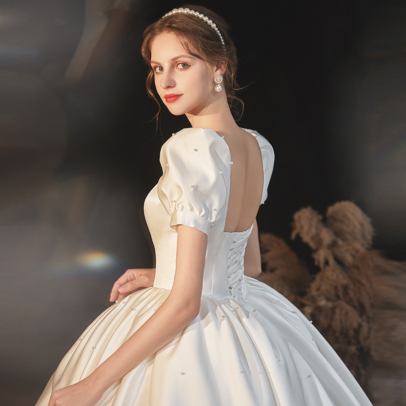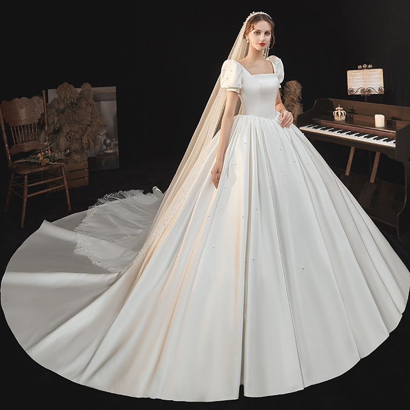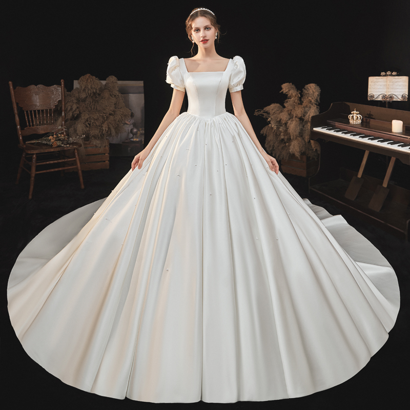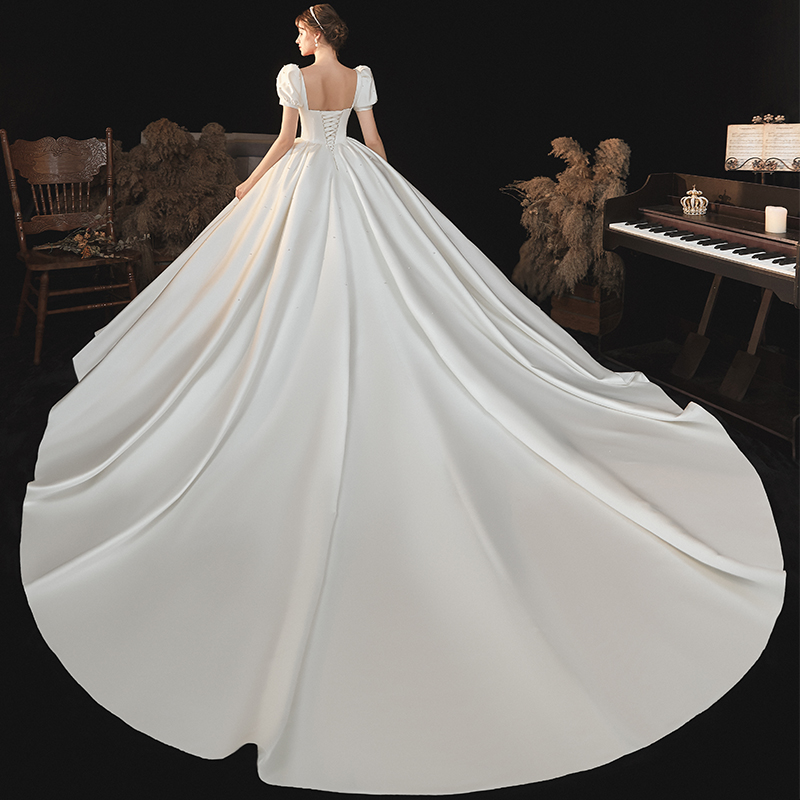 Purple Fairy style silk satin finish main wedding dress 2022 new trailing bubble short sleeve temperament bride Jane Joy's autumn