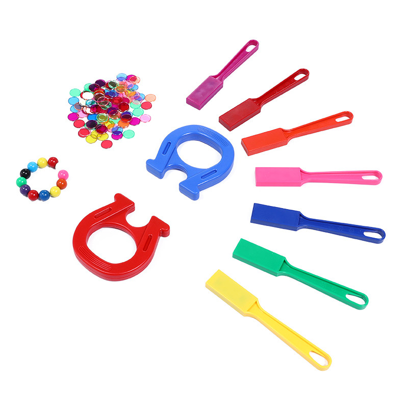 Horseshoe magnetic red 100 discs, one magnetic stick, random color, 100 discs, 50 colored metal edge discs, one magnetic stick, one yellow, 12 magnetic balls, magnetic suction