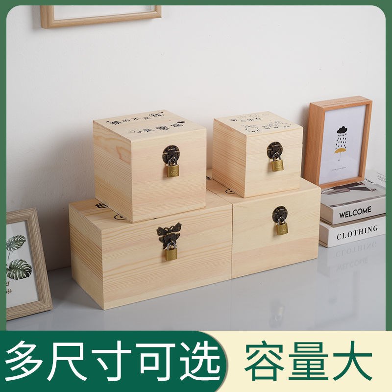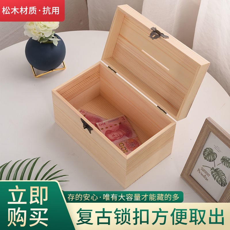 Wooden piggy bank with key, large size with lock, children can deposit and withdraw money box, creative large-capacity net red