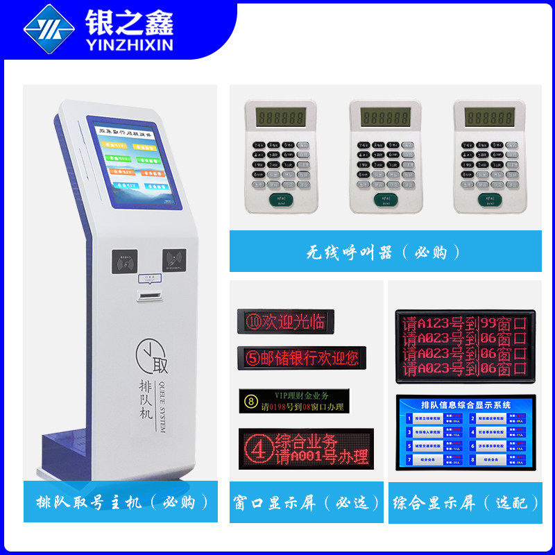 17 inch queuing machine A17 inch queuing machine B wireless pager touch tablet pager five word LED screen eight character LED screen button type evaluator flat panel evaluator four rows eight Chinese characters comprehensive screen 32 inch LCD window display 43 inch LCD comprehensive display ID card reader genuine queuing calling system software add a pager, display, evaluator