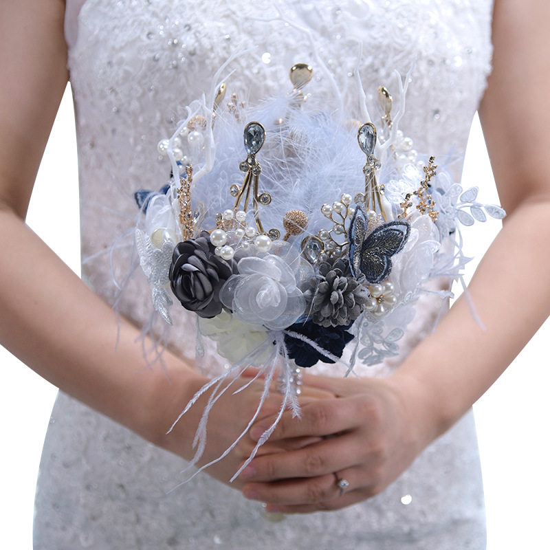 Hand held flower feather flower sceptre crown bouquet pearl crystal diamond European-style embroidered ball for bride wedding gift