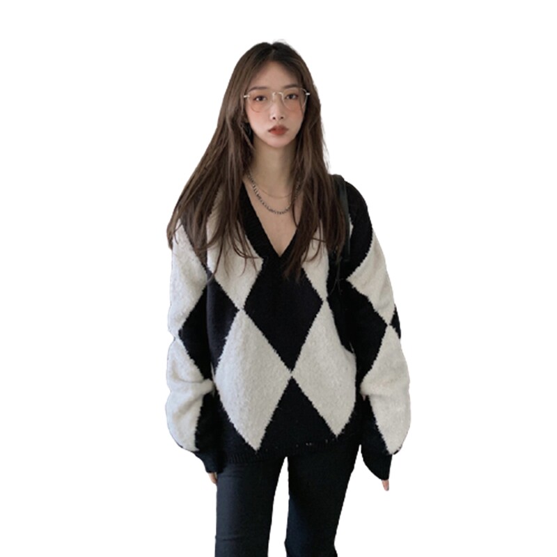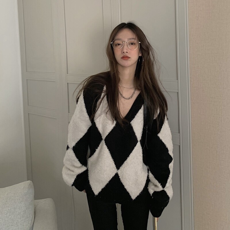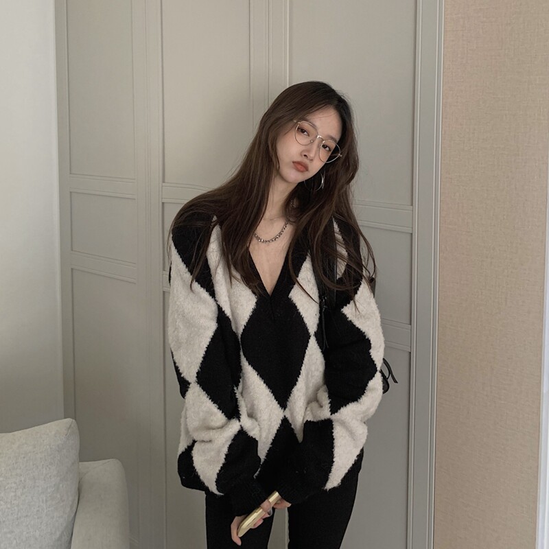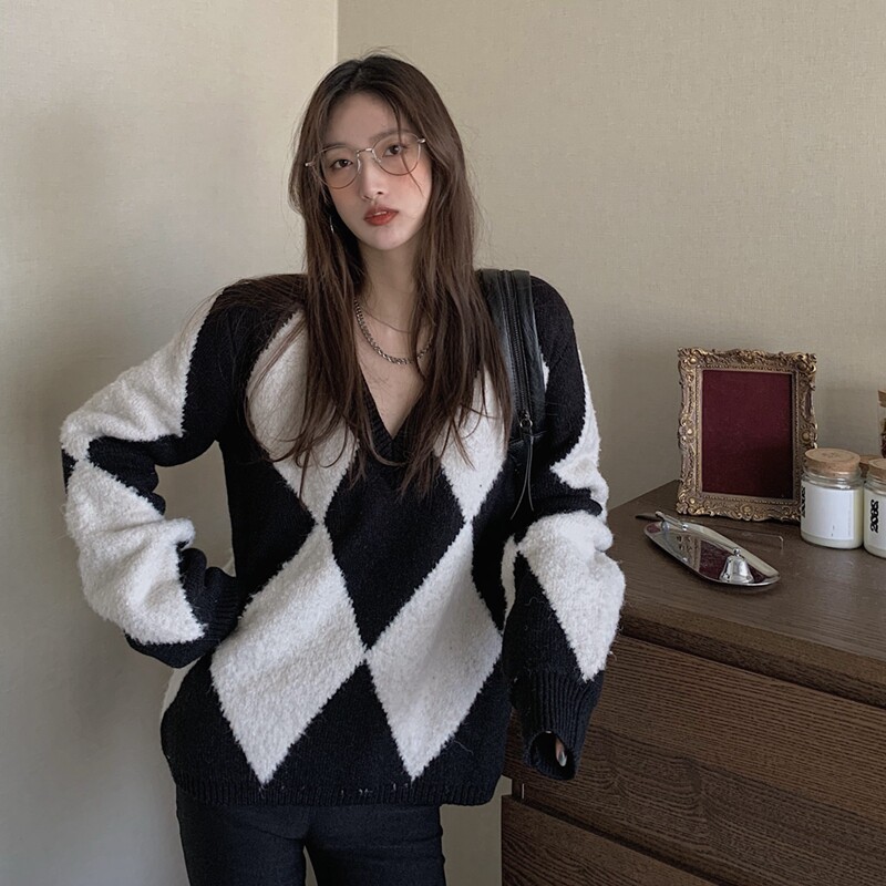 Age-reducing top Western style retro Hong Kong flavor V-neck black and white contrast color loose sweater women's French lazy style