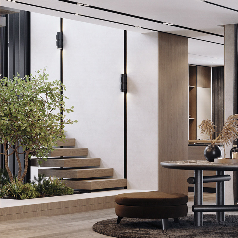 Simulation green plant decoration design and match hotel stairs under construction with light extravagant and luxuriant tree banyan tree soft-mounted landing plant
