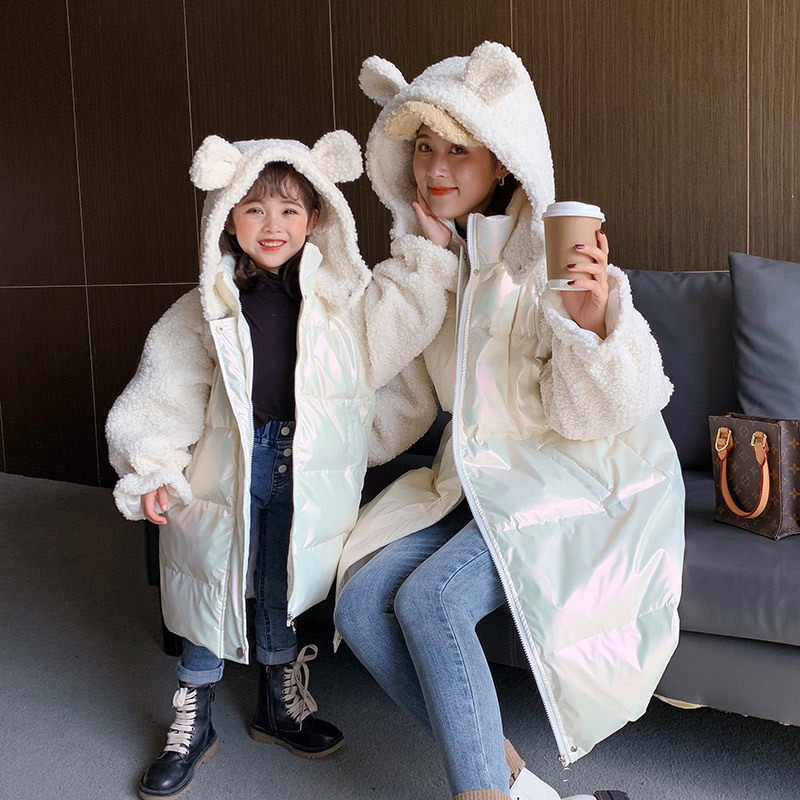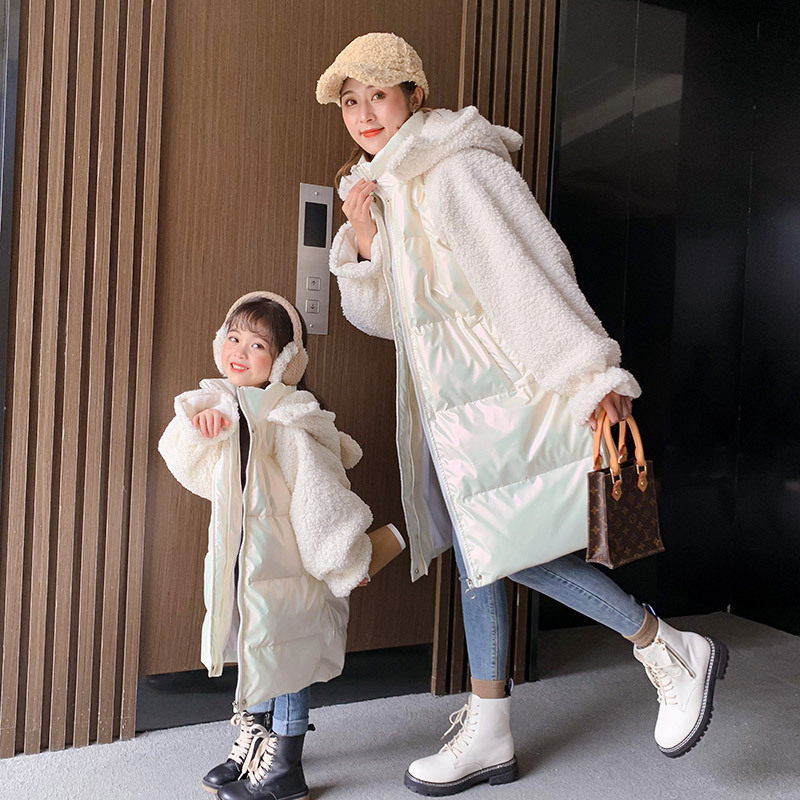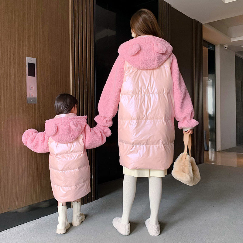 Parent-child bright leather down jacket 2022 winter new high-end foreign style splicing long coat fried street mother and daughter trend
