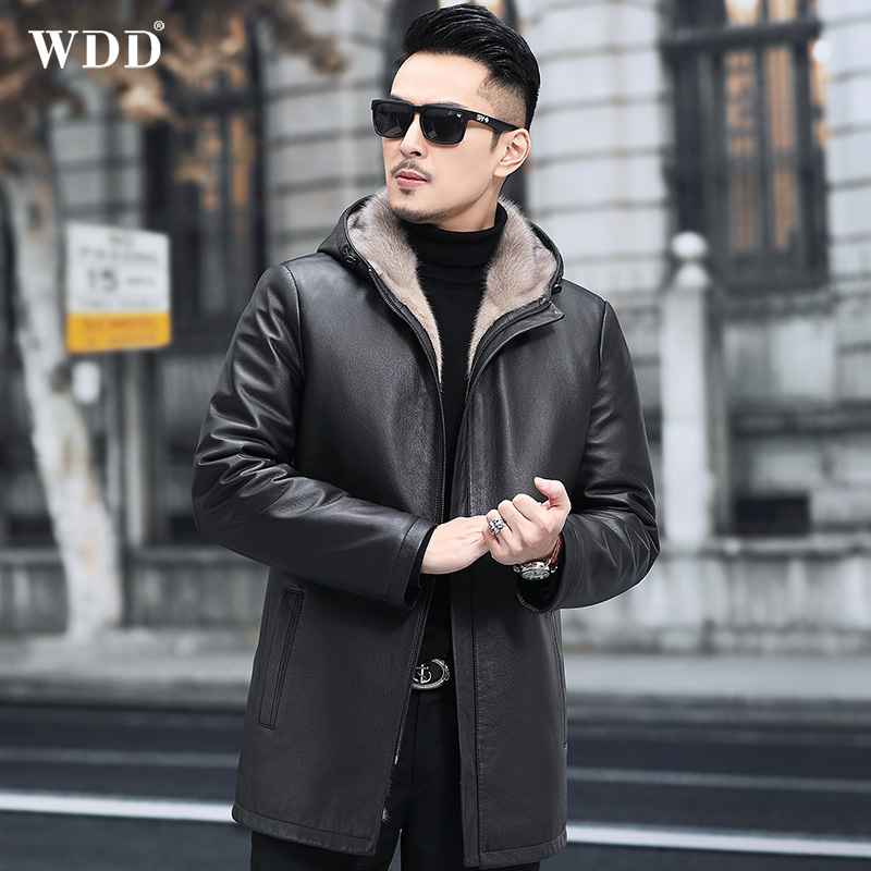 Mink coat men's first-layer tire cowhide leather jacket mid-length hooded Haining pie to overcome the whole mink inner jacket