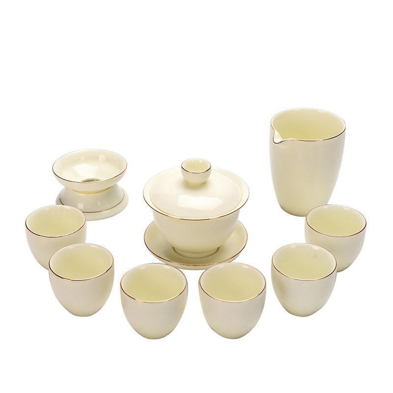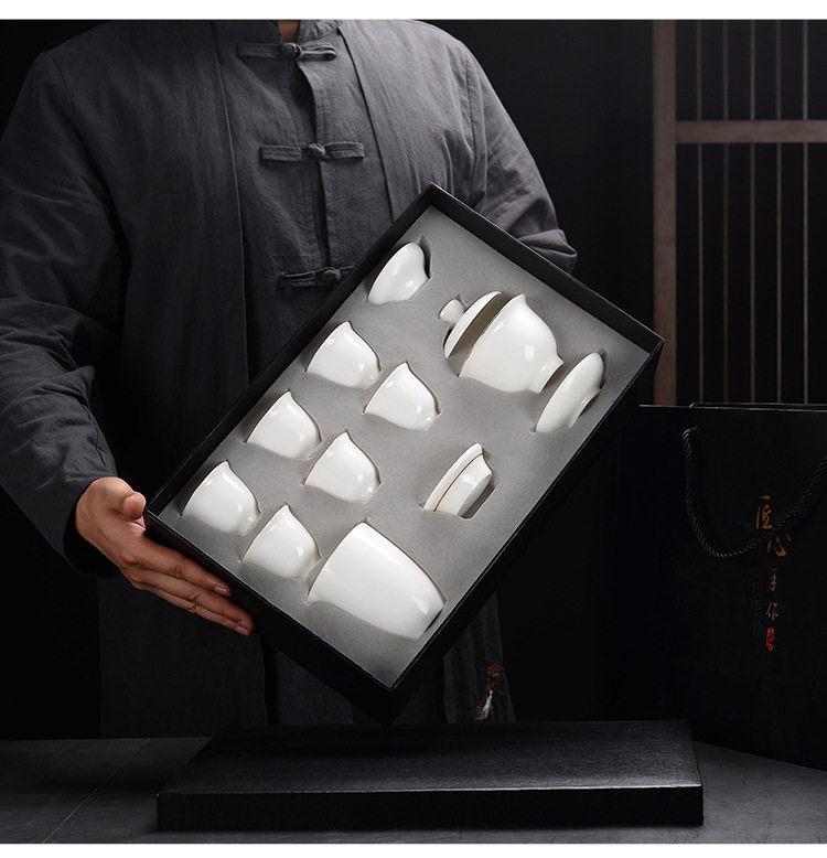 Dehua white porcelain tea set Sheep fat jade set Cover bowl Tea cup Household simple gold office gift small tea set