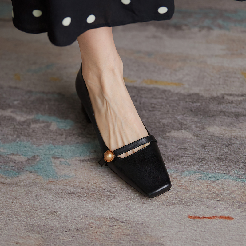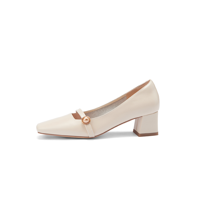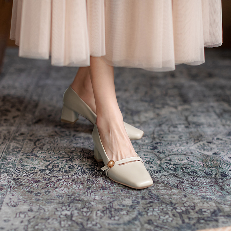 Single shoes 2021 spring and summer White soft leather square head medium heel Vintage French leather small high heel with skirt Mary Jane shoes