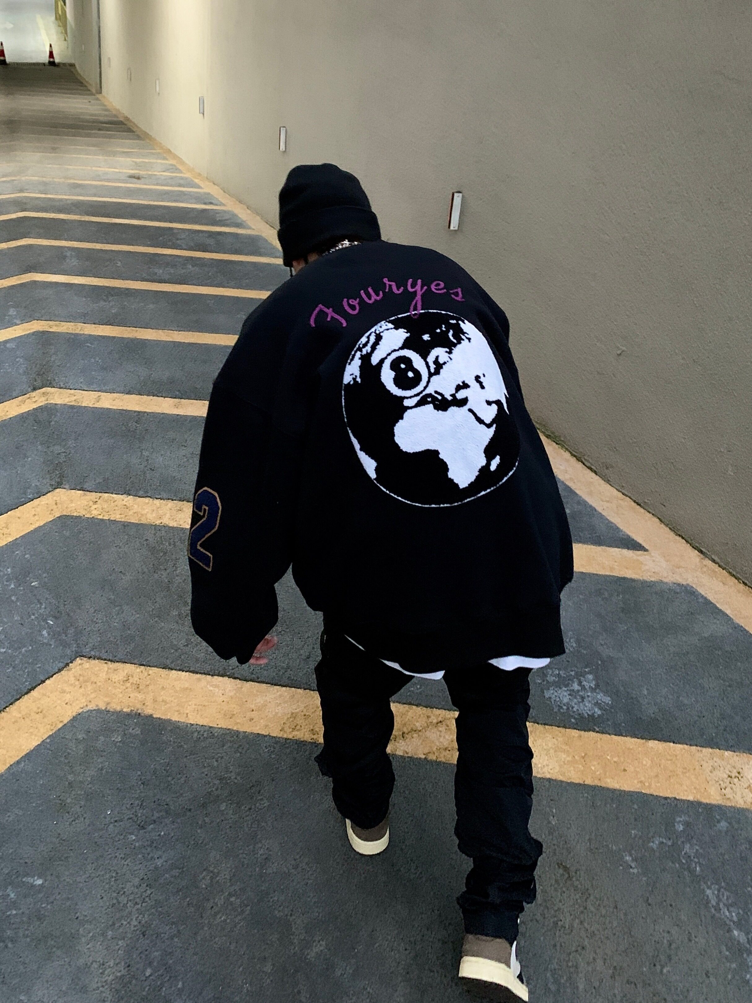 FORUYES (4UYES) retro black eight American street embroidery flocking tide loose plus velvet pullover round neck thick cotton T