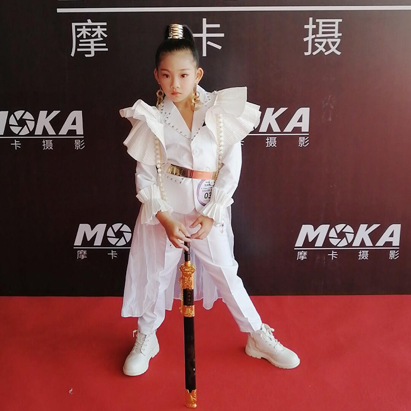 Scalding White Suit Pants Crumpled Shoulder Beads Hand All Gold Belt White Sand Tug Gold Wire Head Accessories Add Silver Ring Ear Pendant Bronzed Suit White Suit White Crumpled Shoulder gold belt white yarn Drag male and female