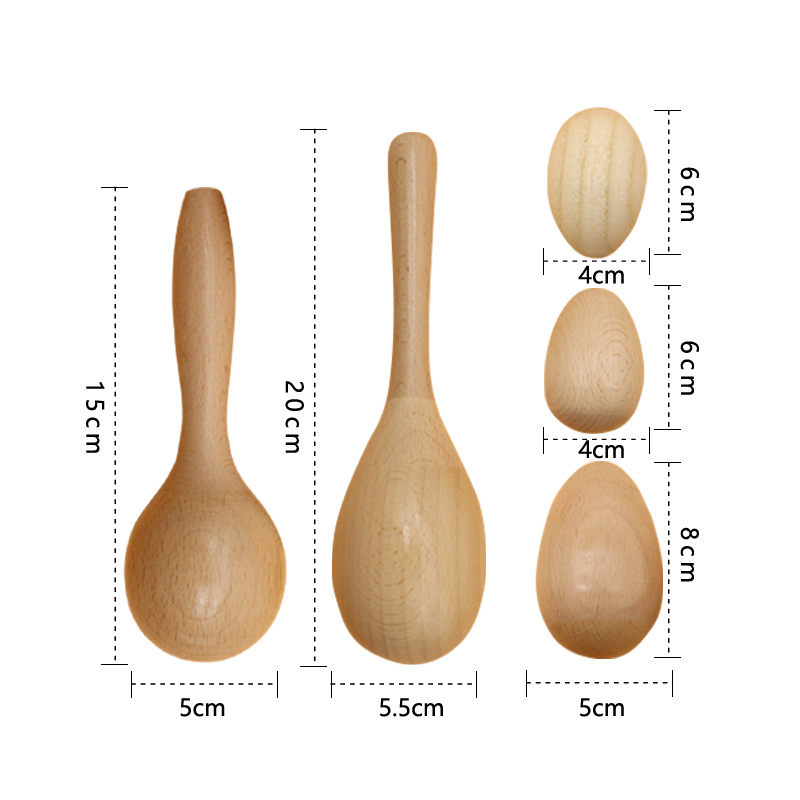 A pair of small beech sand hammers (15cm) a pair of large beech sand hammers (20cm) a pair of small beech sand eggs (4*6cm) a pair of large beech sand eggs (5*8cm) a pair of small beech sand eggs (4*6cm)