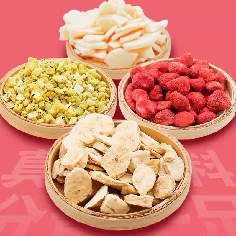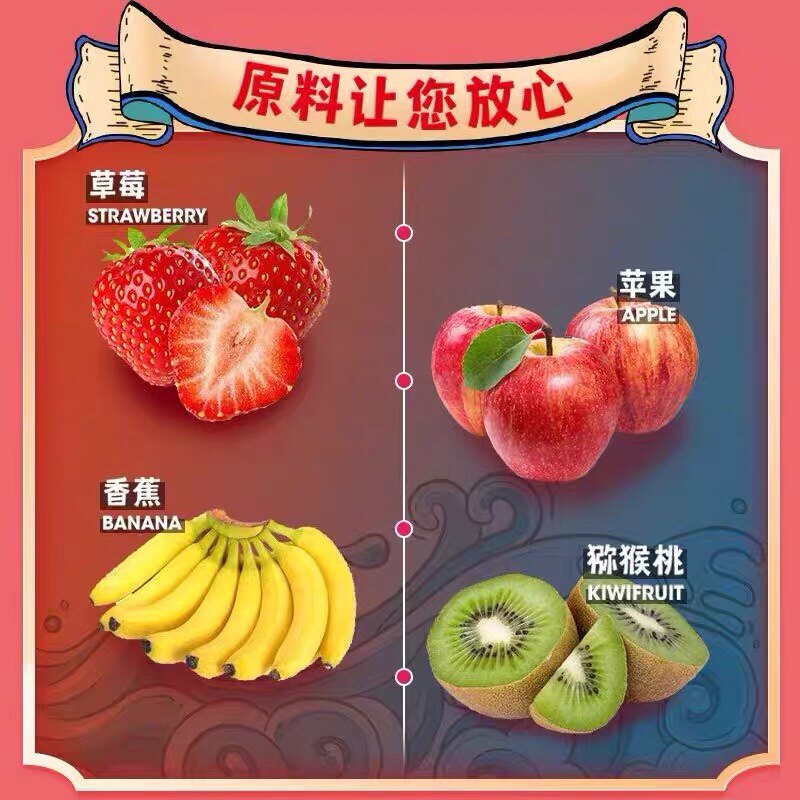 Yellow peach 30g barrel dragon fruit 80g barrel kiwi fruit 45g barrel strawberry whole 25g barrel banana slices 70g barrel apple slices 45g barrel asparagus grains 38g barrel purple potato 90