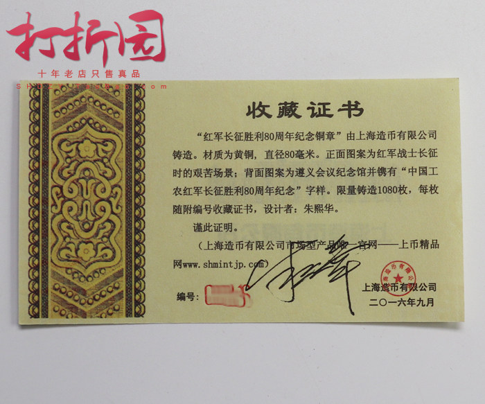 China's Workers and Farmers Red Army Long March Victory 80 Annual Copper Chapter Long March brass band Signature 80mm with box certificate
