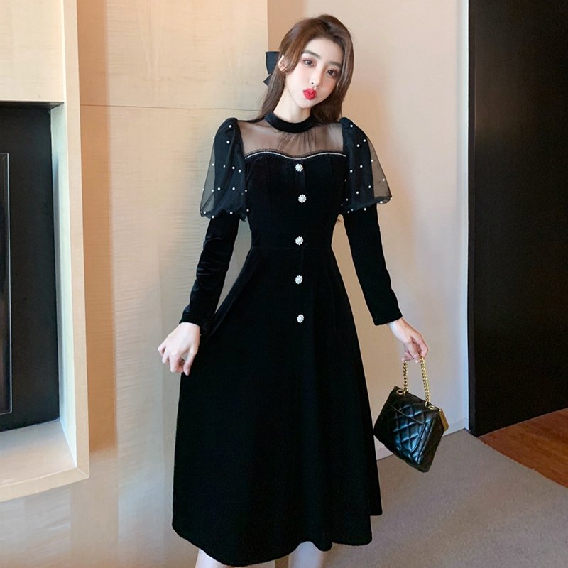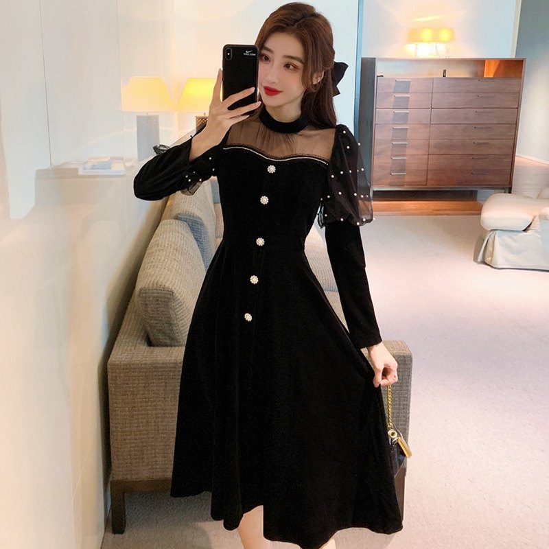 Plus Size Women's Fall/Winter 2020 New Round Neck Mesh Patchwork Takes Over Knee Long Skirt Nailed Bead Slim Midi Dress