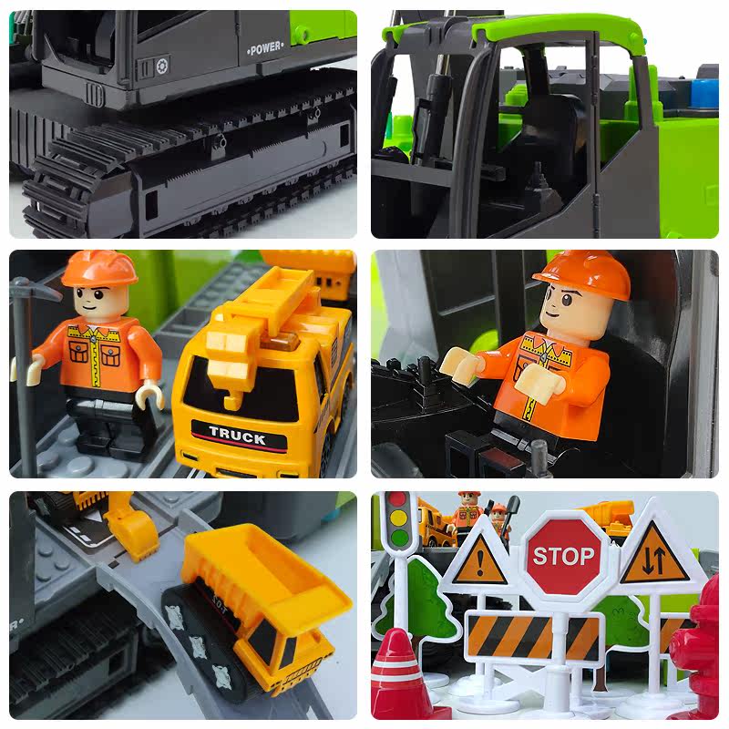 Green oversized excavator (lifting tower + scene barricade + 4 alloy cars)