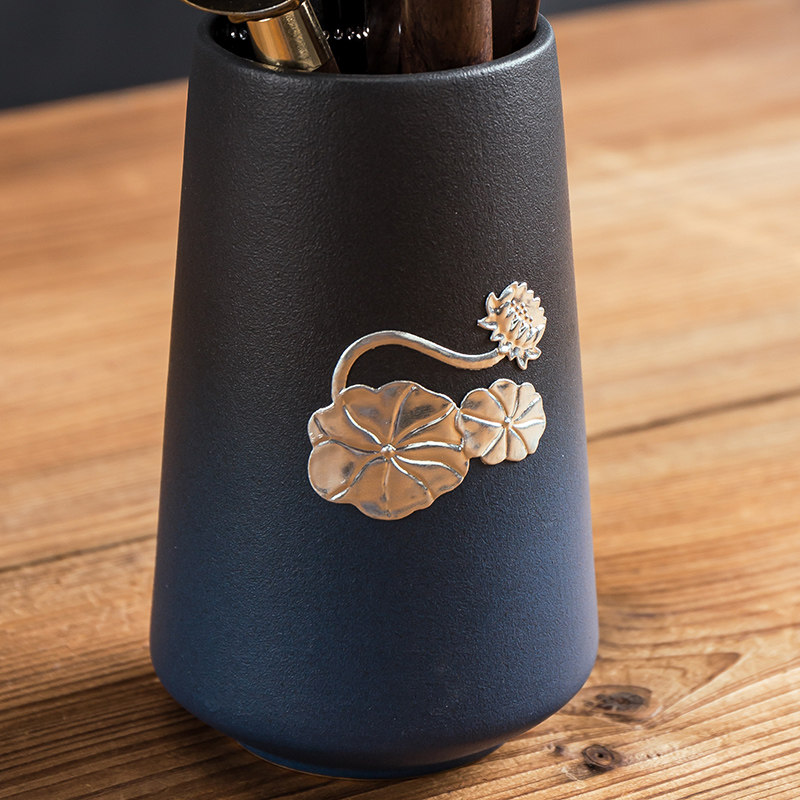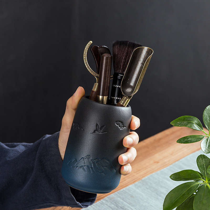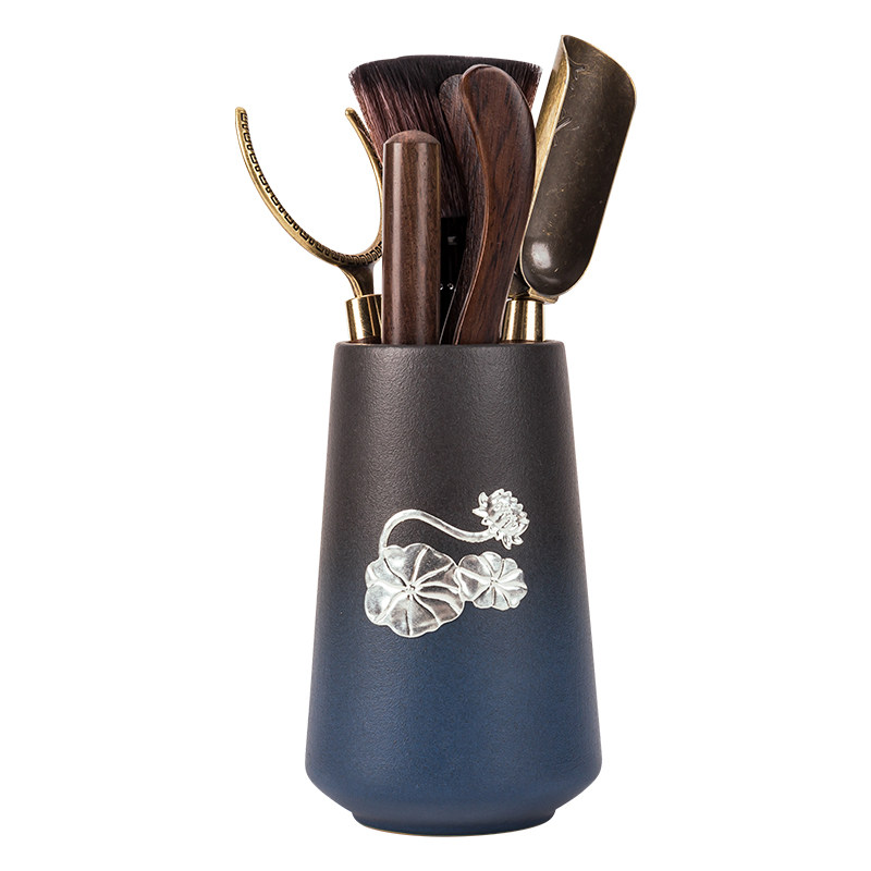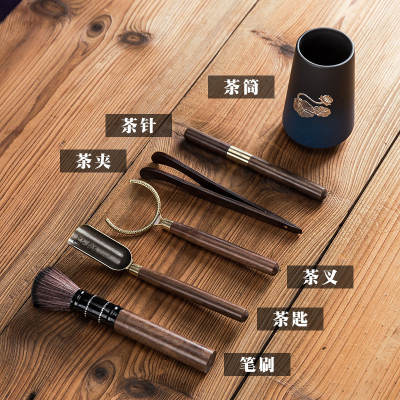 Tea ceremony six gentleman set Ceramic black sandalwood household solid wood metal Gongfu tea accessories storage cylinder six-piece set