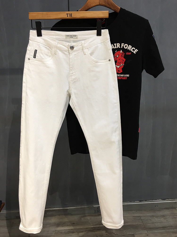 White High-end Casual Men's Jeans 2022 Summer New Tide Card Elastic Body small feet long pants thin