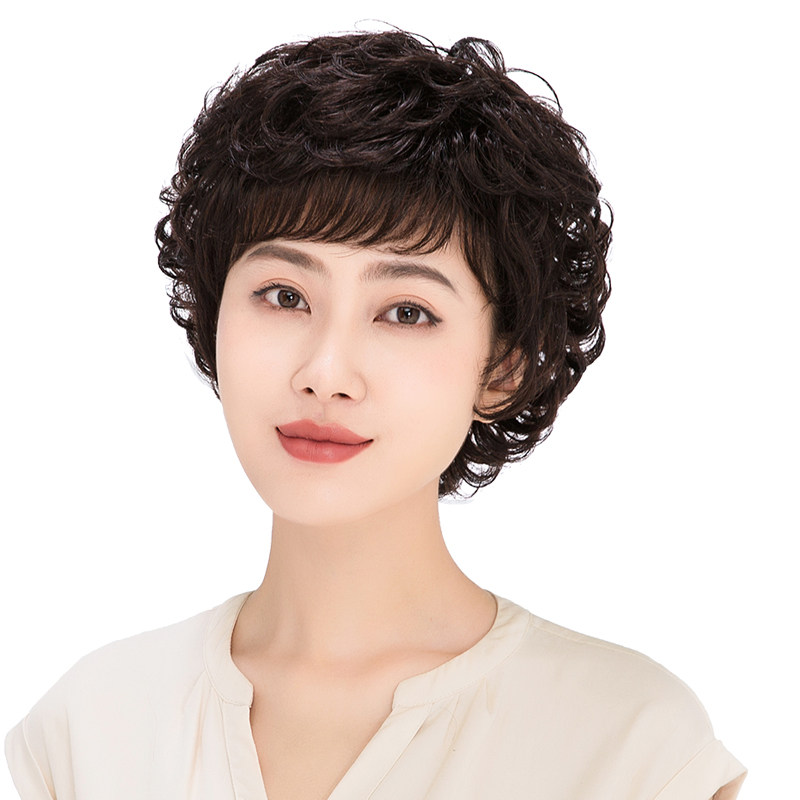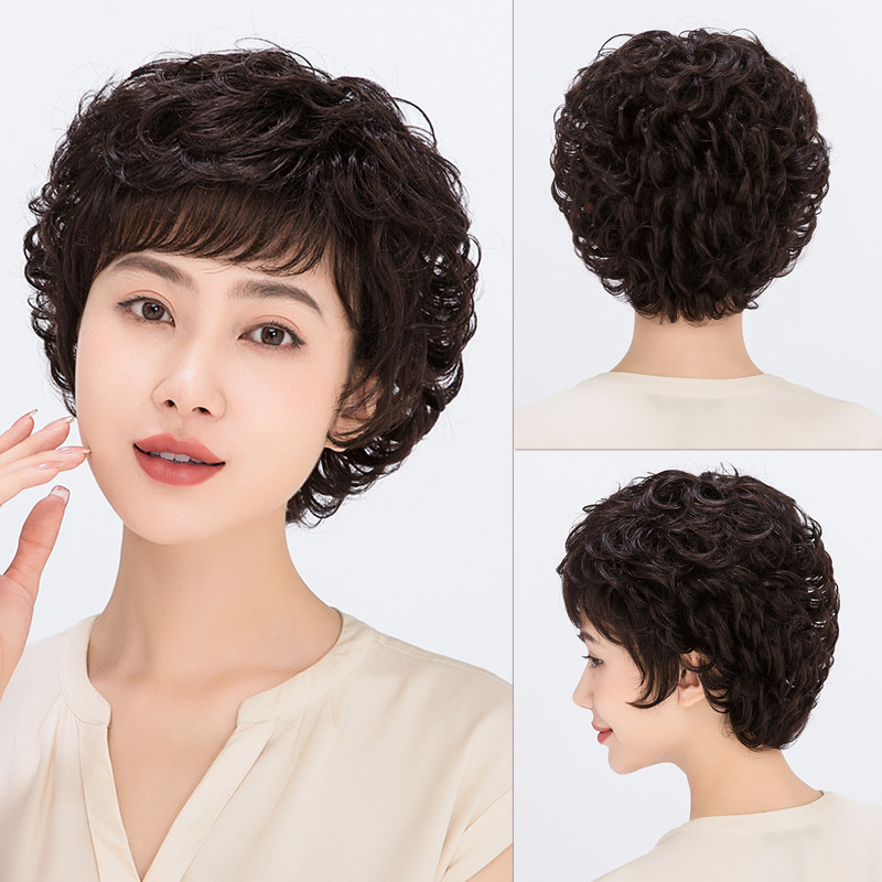 Wig women's short hair mom's real hair Women's middle-aged short curly natural temperament fluffy full head cover style