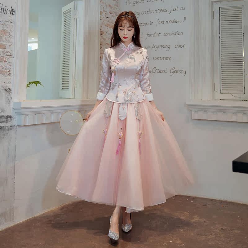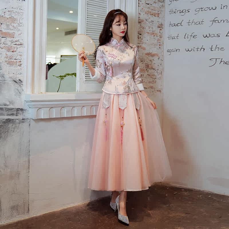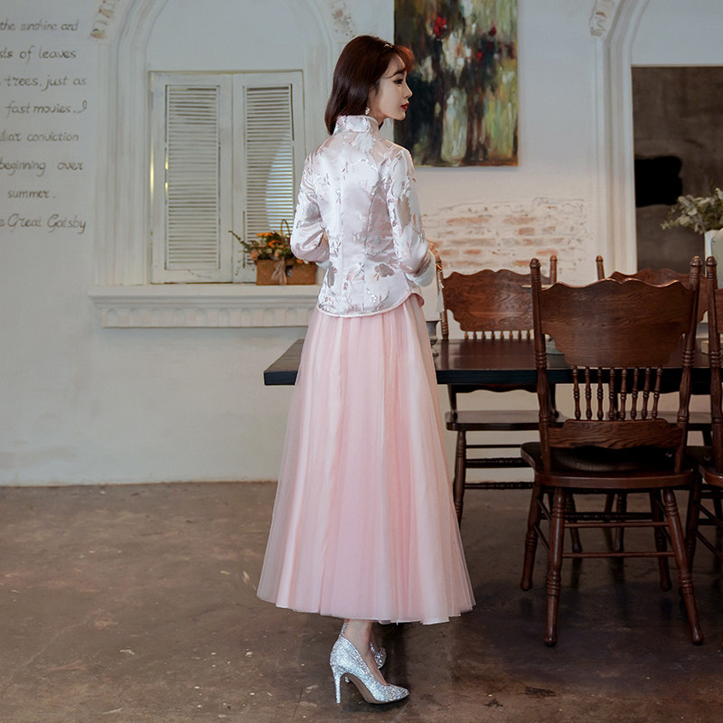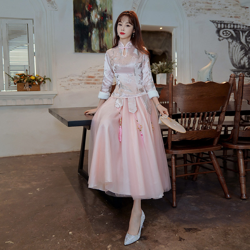Chinese Pink Bridesmaids 2022 new Summer Chinese Wind Sisters warm and thick long sleeves wedding evening dress