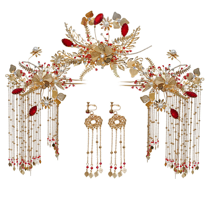 Chinese style ancient clothes golden long flow Su retro show and head decorated with bride's classical wedding photo gallery styling steps and accessories