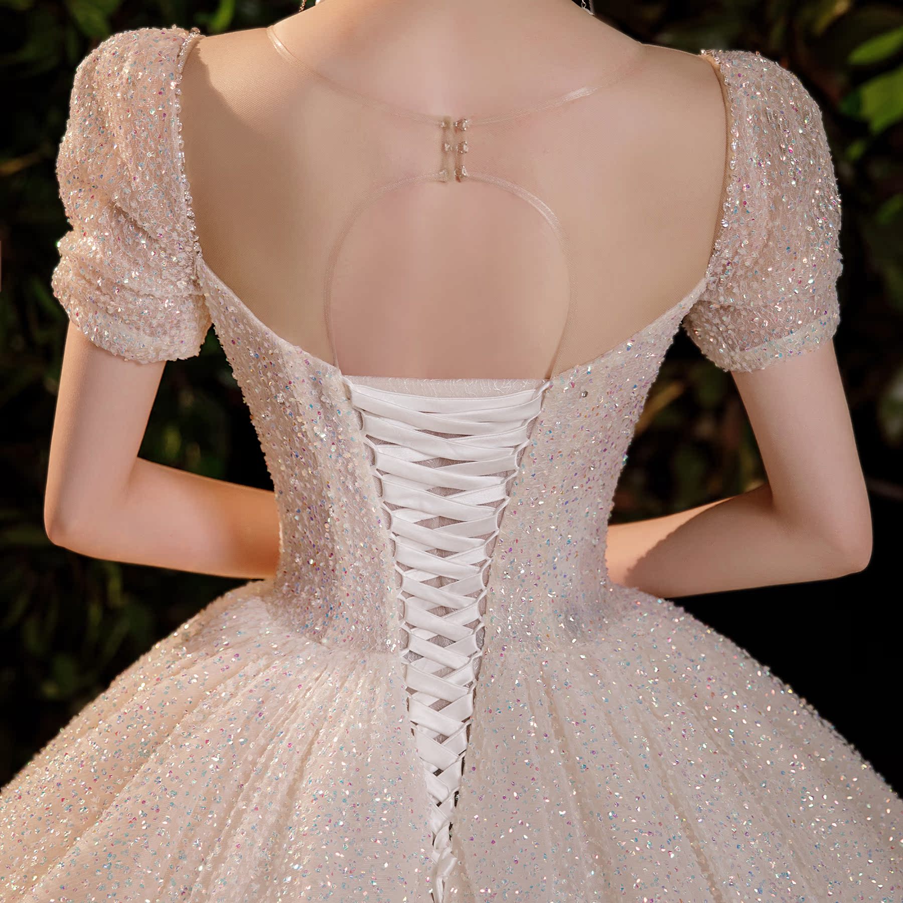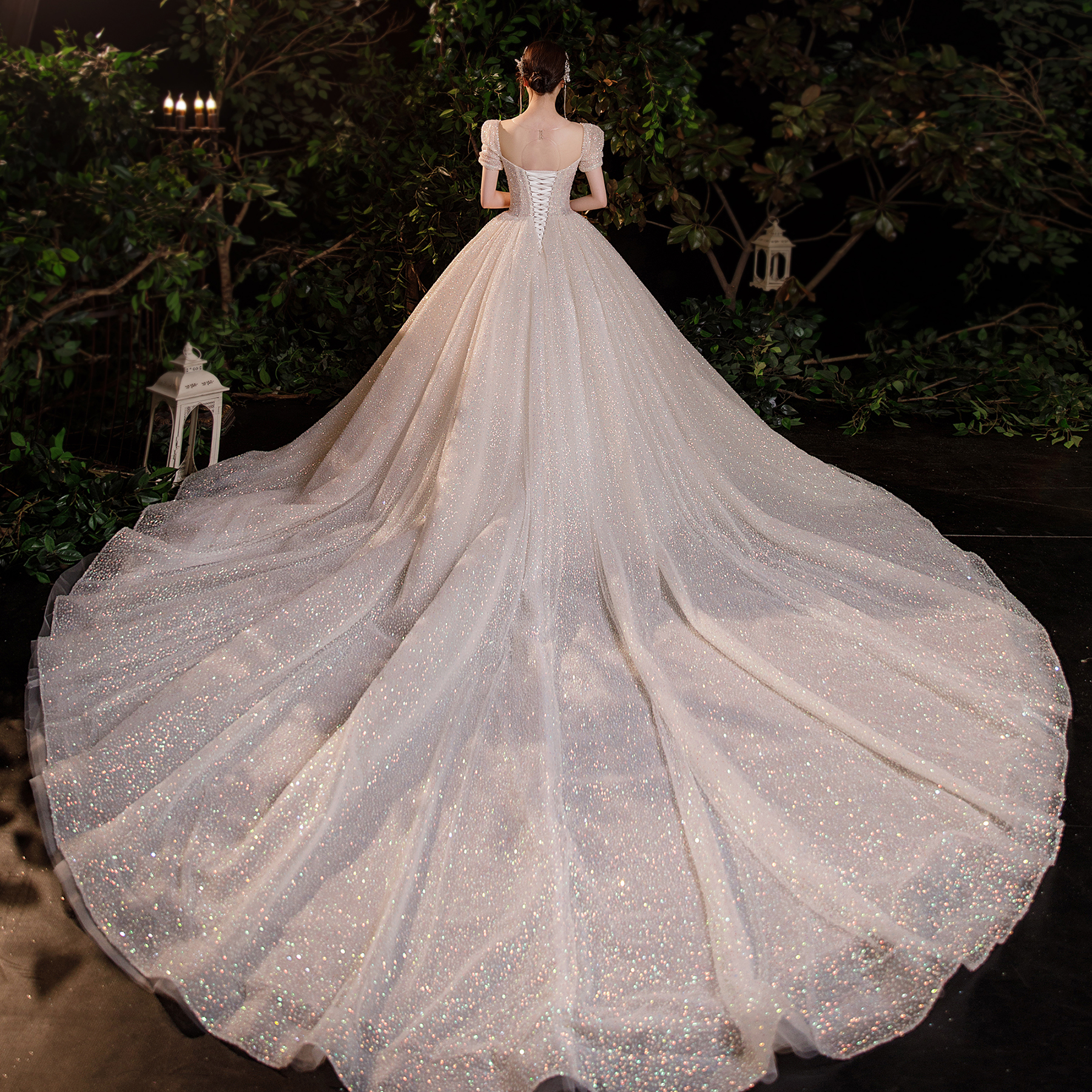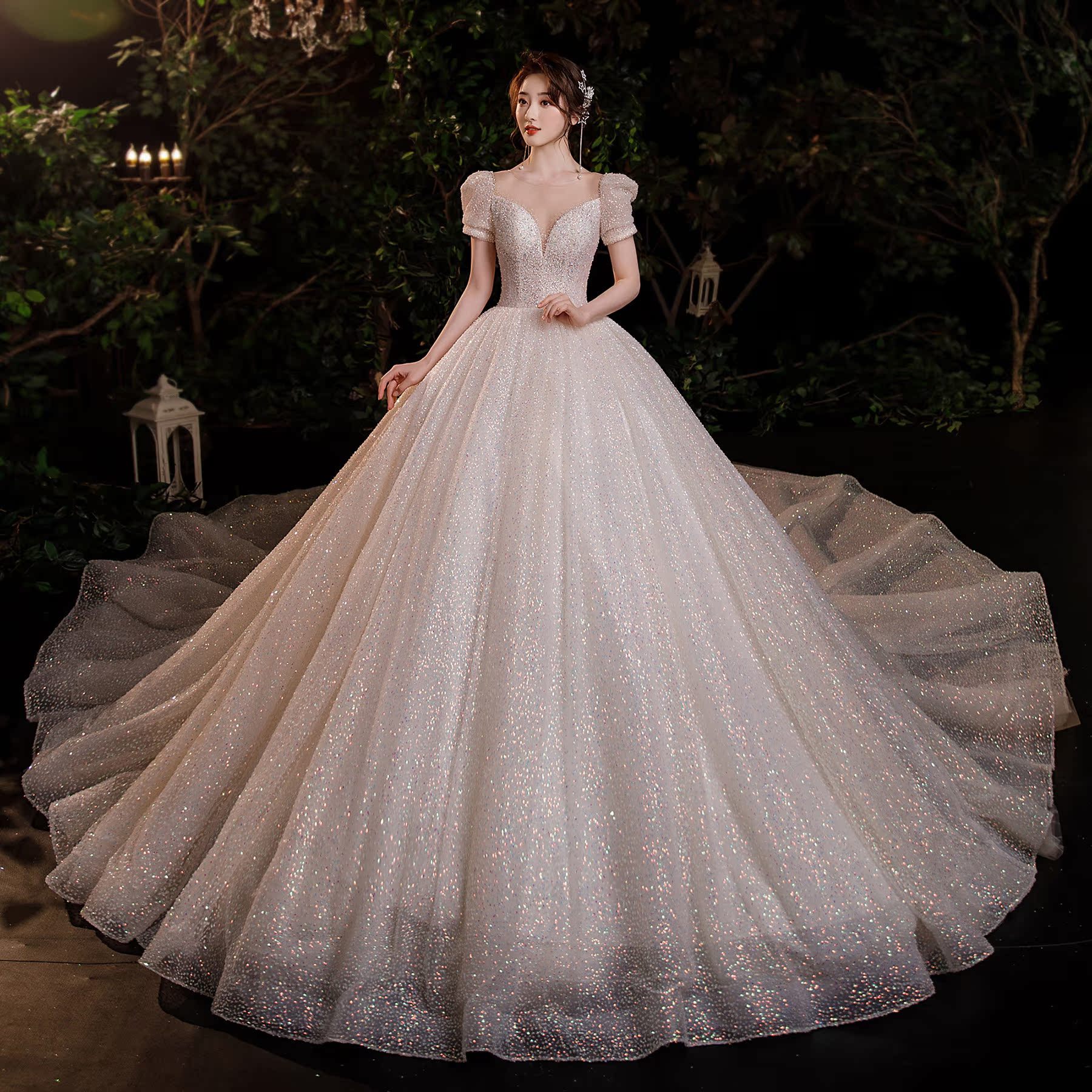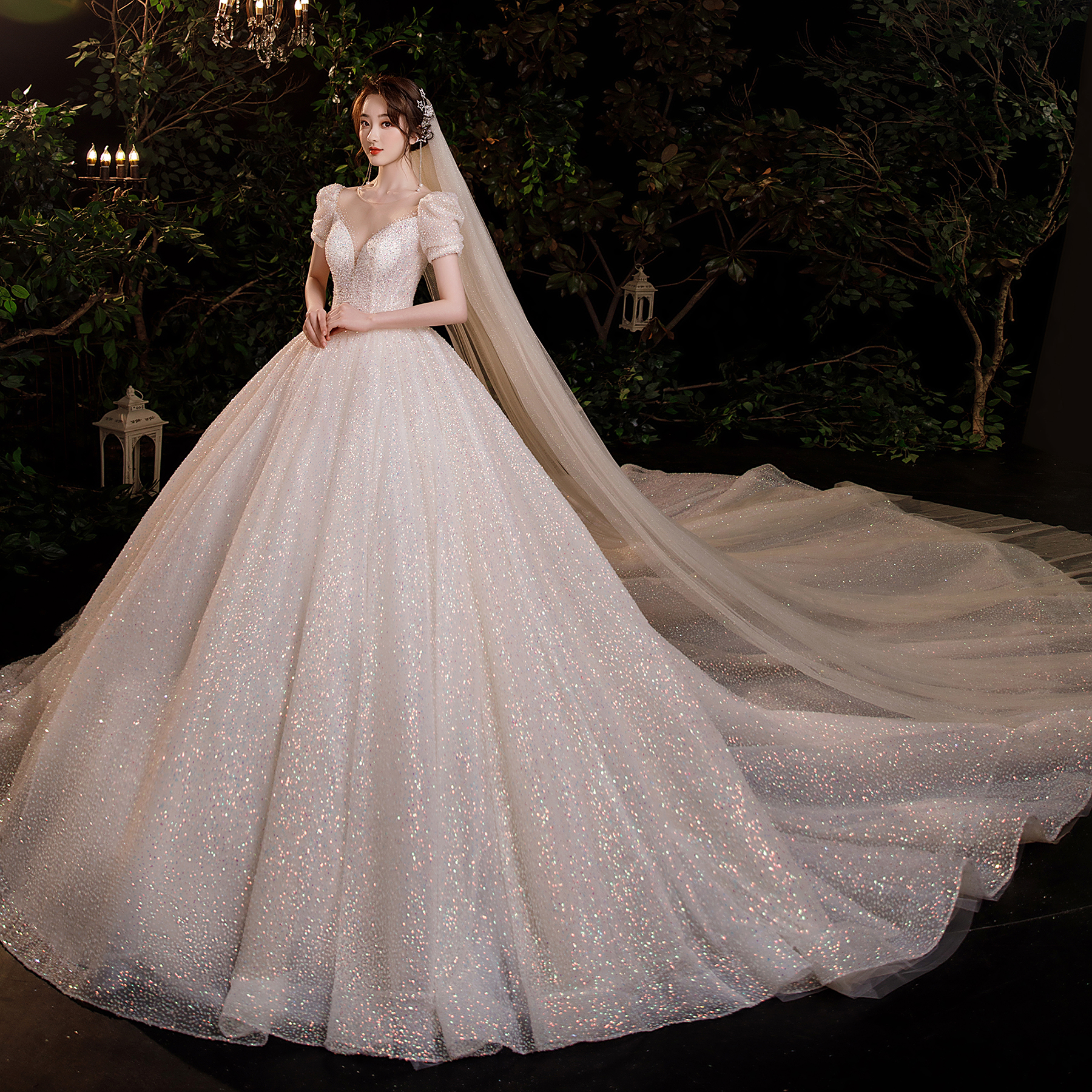 Wedding dresses 2022 new brides bubble sleeves starry sky extravagant superfairy V collar high-end French court Grand Trailing