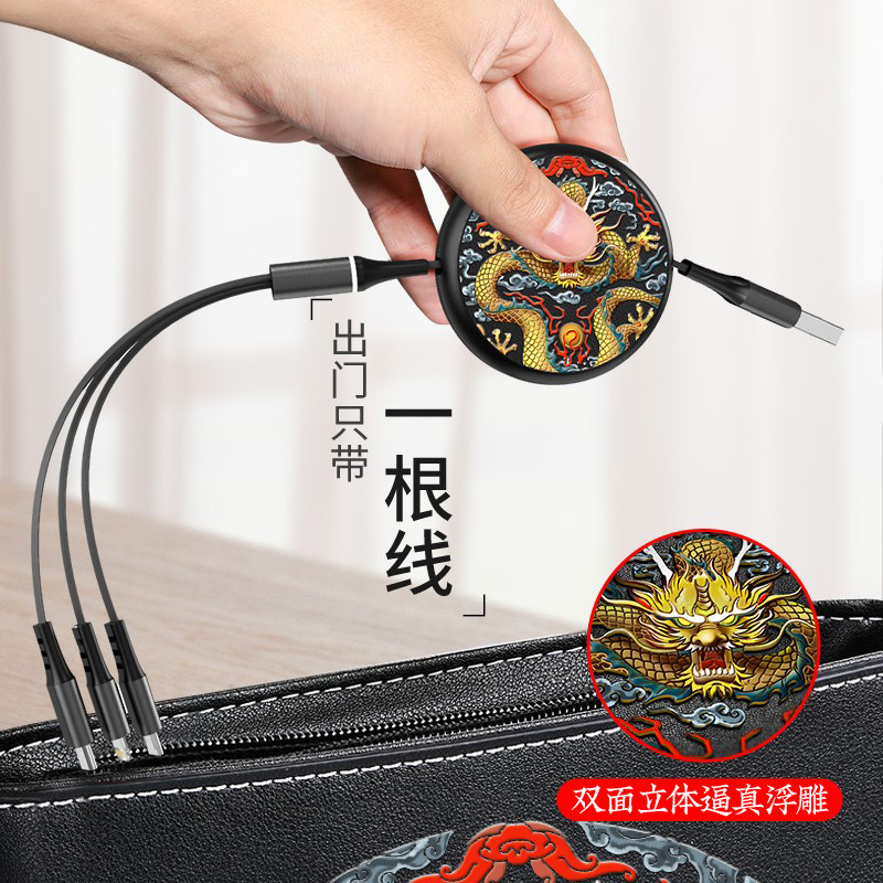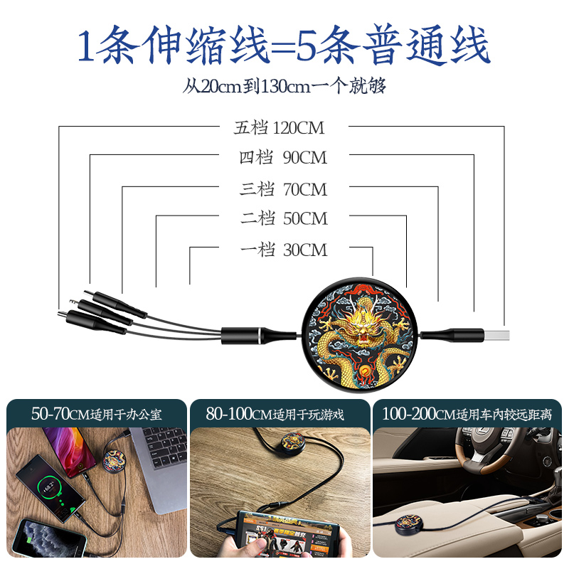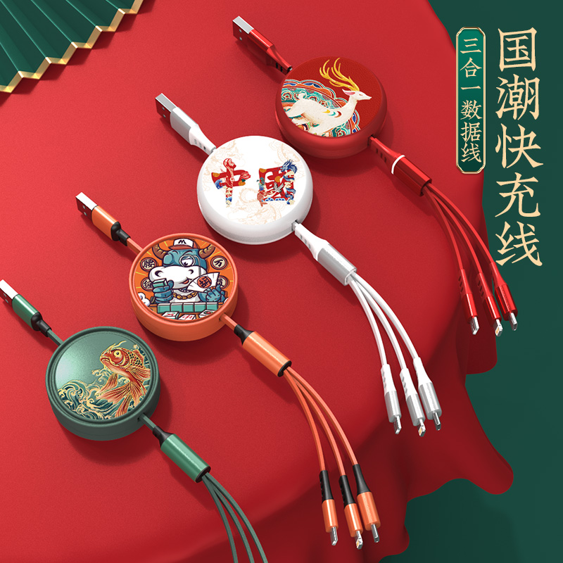 Vehicle telescopic China Wind data line One drag Three-charge wire instrumental three-in-one quick-charge multifunction suitable for Apple Android Yan value Huawei tapyc vehicle tpyec mobile phone punch electric bulls