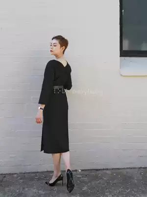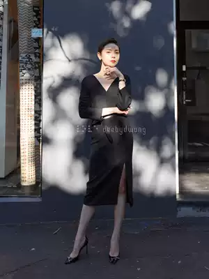 deebydwang black dress female autumn and winter wool single wear bottoming new French socialite