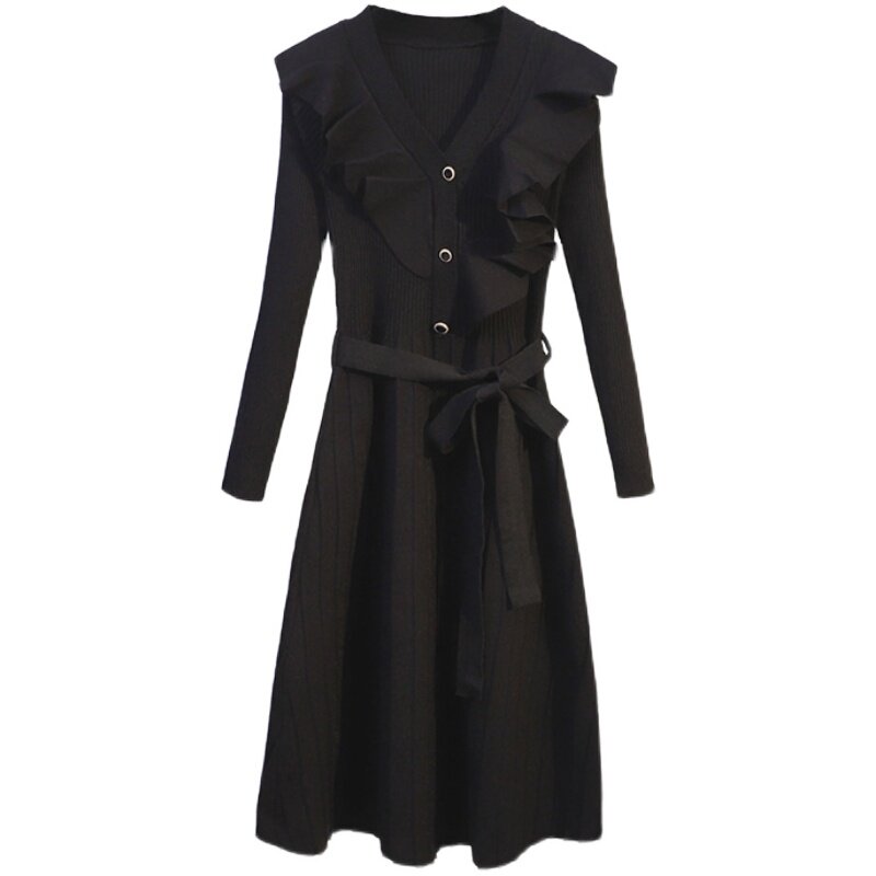 Temperament lotus leaf knitted V-neck nursing dress winter bottoming waist slim nursing sweater over the knee mid-length version