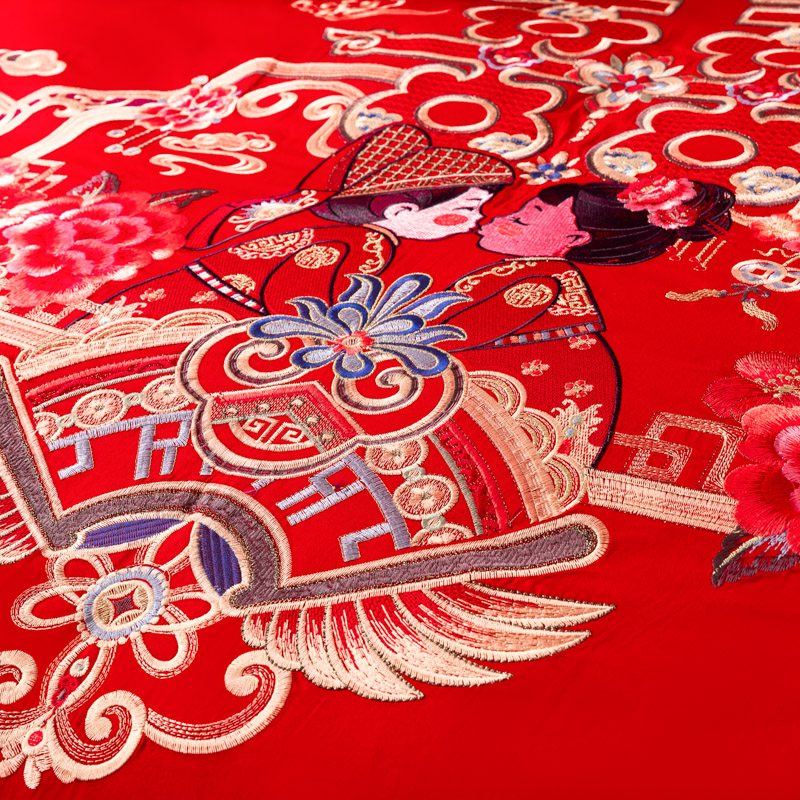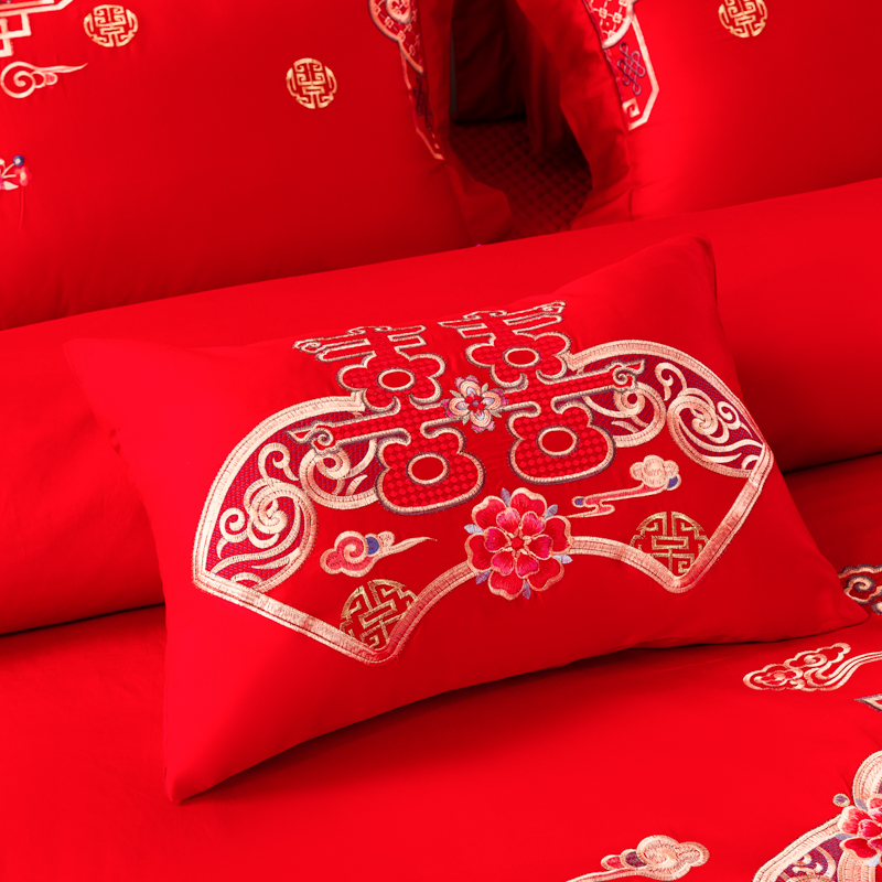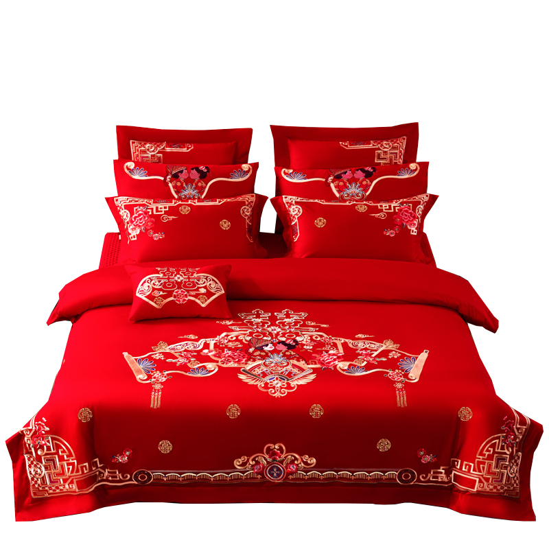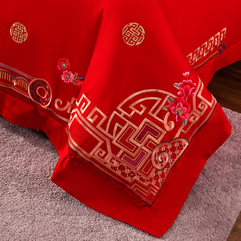 Wedding four-piece set of 100 long-staple cotton big red cartoon embroidery happy quilt new house wedding full set of sixty-piece set