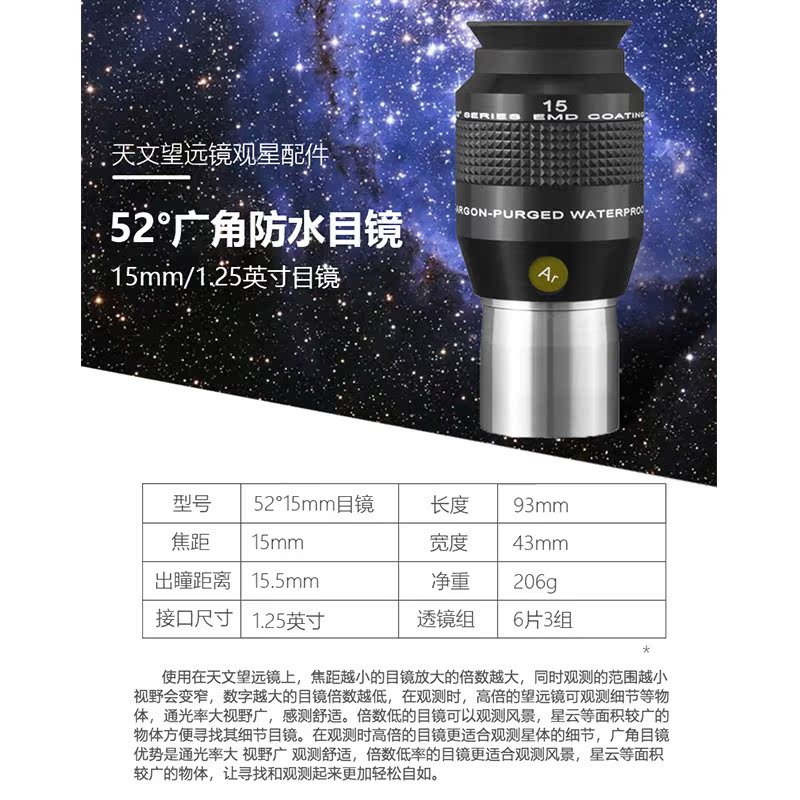 Exploration Science Ultra High End Wide-angle Eyepiece 52 Degrees 15mm Argon Waterproof High Definition Planet Deep Space Observation Eyepiece