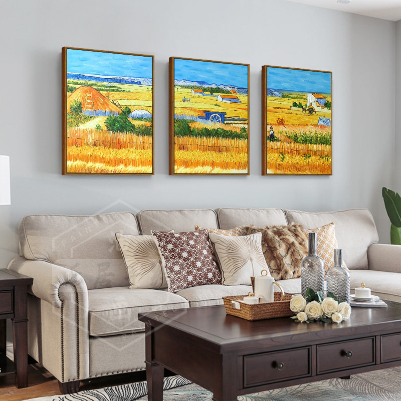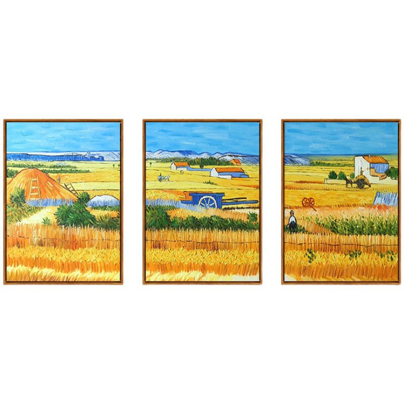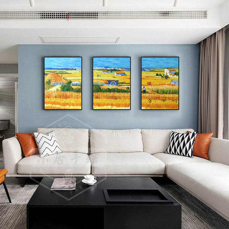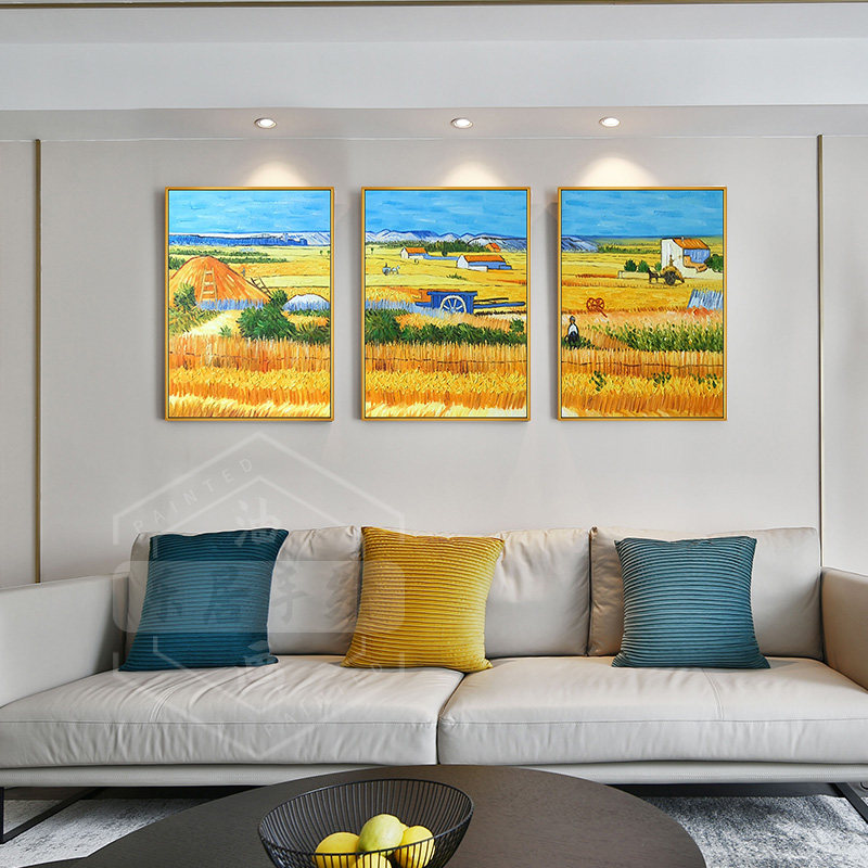 Modern living room sofa background triple hanging painting pure hand-painted oil painting Van Gogh decorative painting harvest wheat field Dafen Village painting